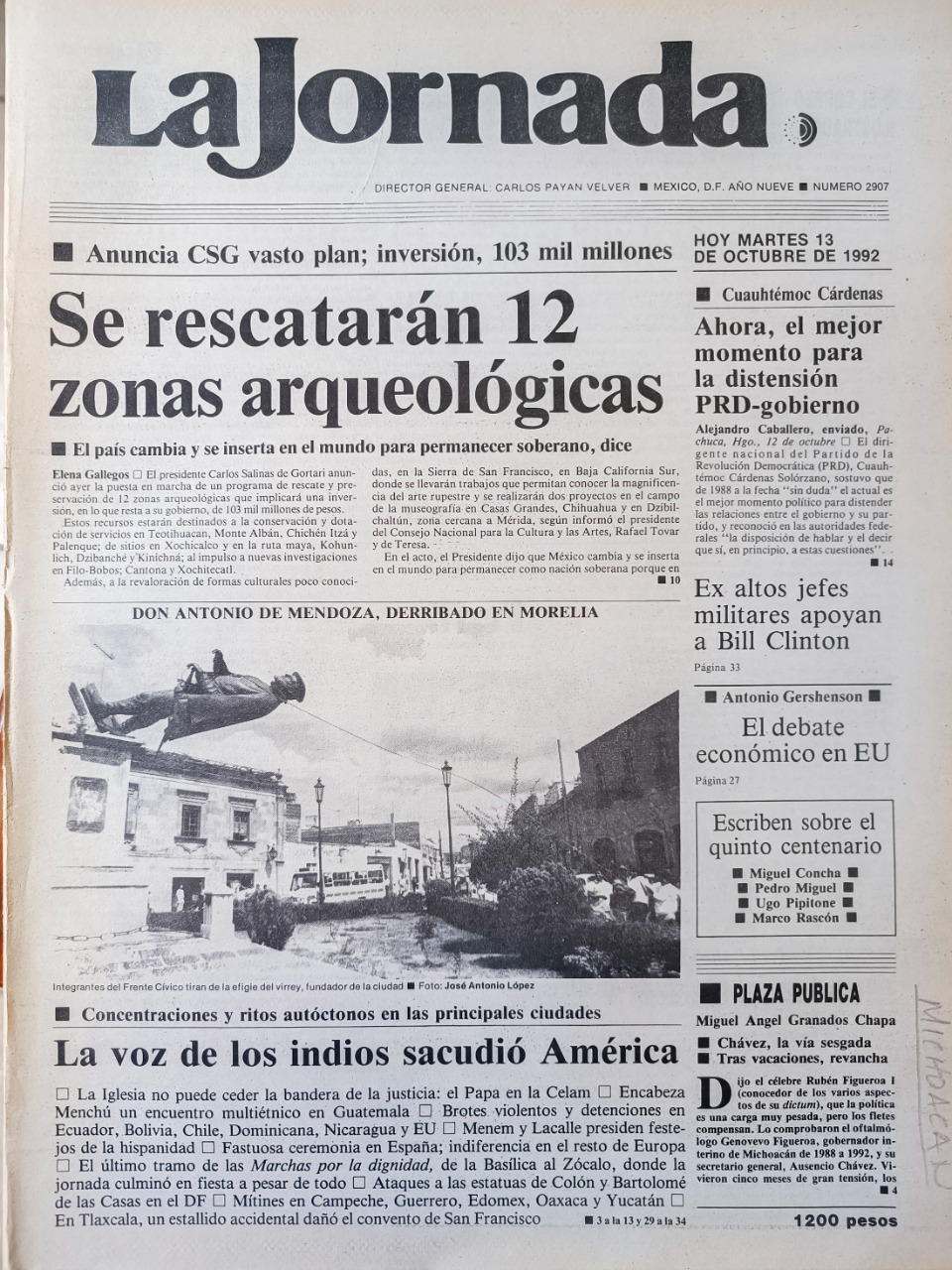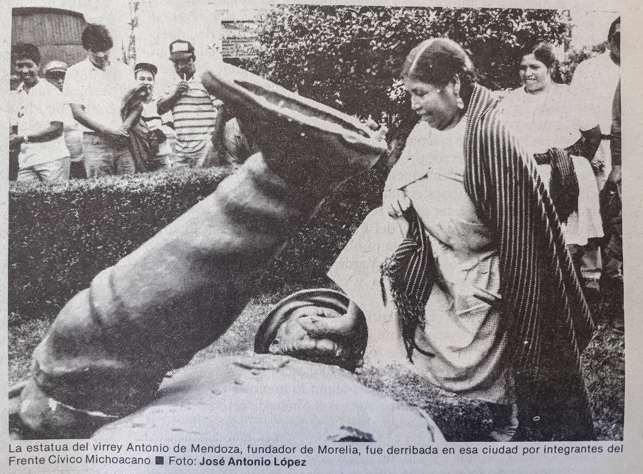 En 1992, Michoacán vivía una efervescencia política; un gobernador interino y el partido de oposición al gobierno mantenía bloqueos, plantones y manifestaciones multitudinarias. Ya había enfrentamiento entre grupos y hasta muertos políticos. En el mundo se protestaba por los 500 años del llamado descubrimiento de America; en Morelia, el Frente Cívico Michoacano (organización de grupos indigenas y populares) convocó a un mitin en la estatua del Virrey Antonio de Mendoza frente a la Casa de Cultura en el Centro Histórico. Posterior, la escultura fue derribada, pisoteada y destruida por las organizaciones.