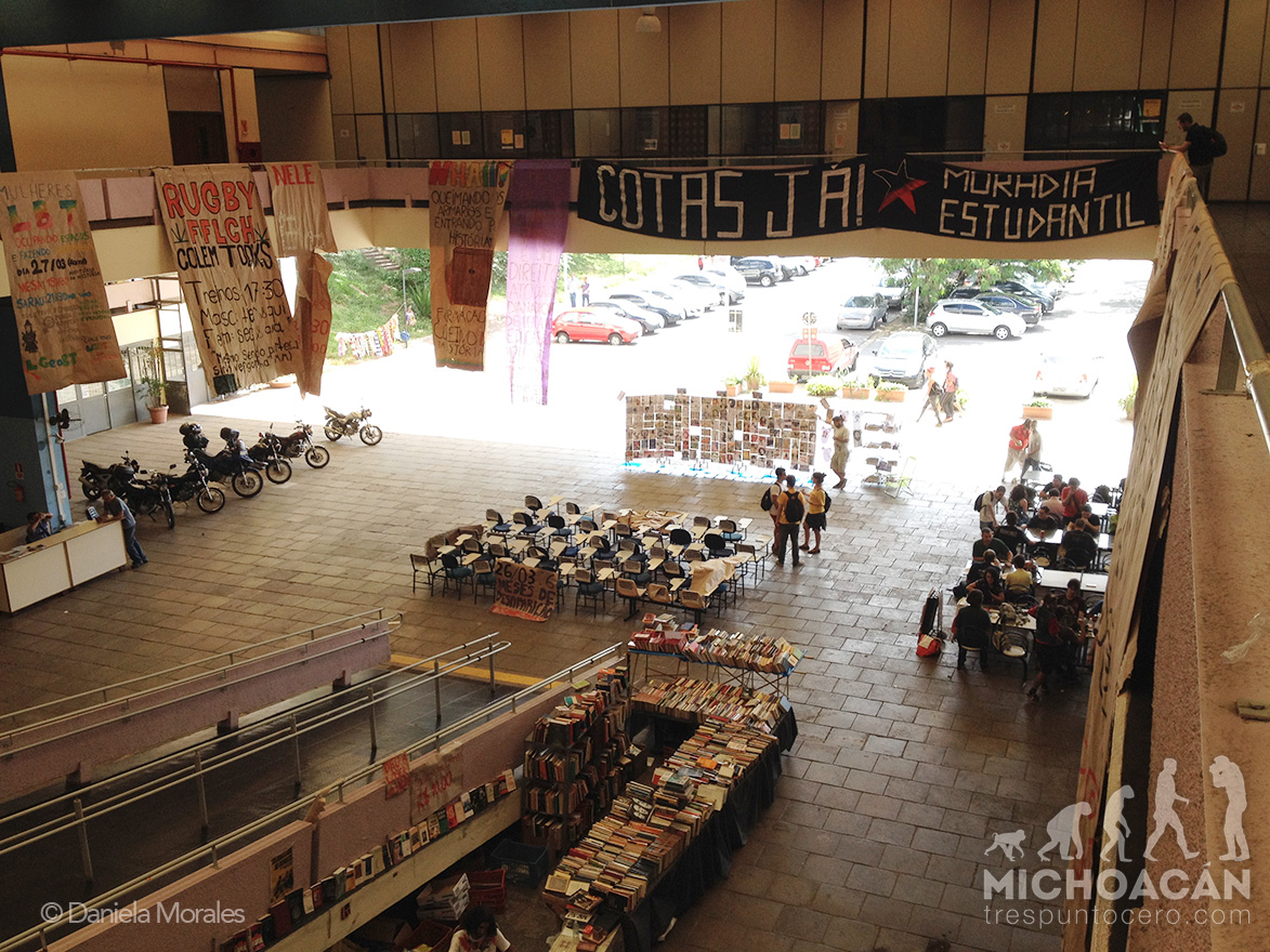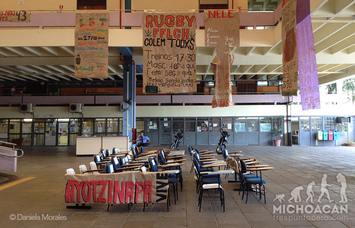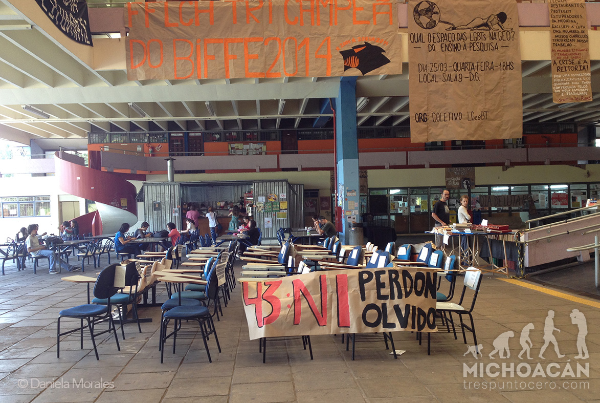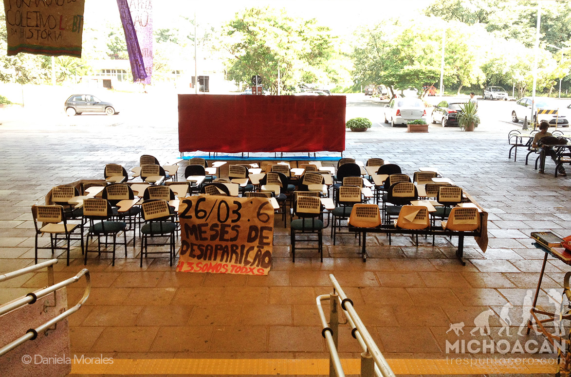 São Paulo, Brasil. Cuarenta y tres  sillas vacías instaladas la explanada central de la Facultad de Filosofía, Letras y Ciencias Humanas (FFLCH) de la Universidad de São Paulo, recordaron este día la ausencia de los estudiantes de la normal de Ayotzinapa, a seis meses de su desaparición forzada. Al frente de la instalación se leía: “No fue el Estado, es el Estado.”