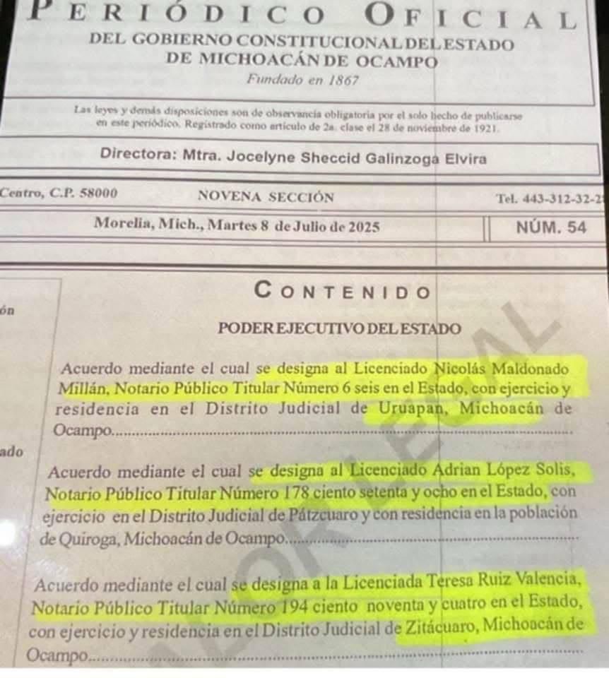 En el mismo documento se formalizaron otros nombramientos: Nicolás Maldonado Guillén fue designado titular de la Notaría Pública número 6 en el Distrito Judicial de Uruapan, mientras que Teresa Ruiz Valencia asumirá la Notaría número 194 en Zitácuaro.