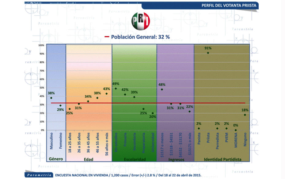 Cabe mencionar que los resultados se basan en la Encuesta Nacional de Vivienda realizada por Parametría entre el 18 y 22 de abril del 2015. En dicho ejercicio participaron mil 200 personas de todo el territorio mexicano.