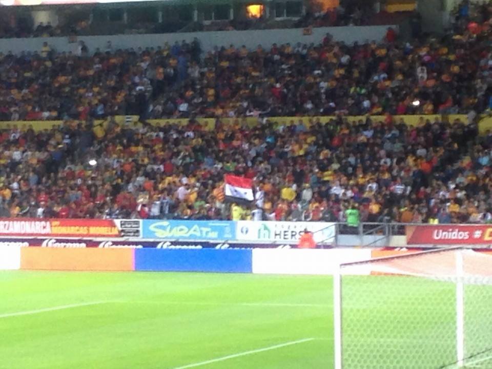 Aficionados sacan bandera Siria durante partido de fútbol