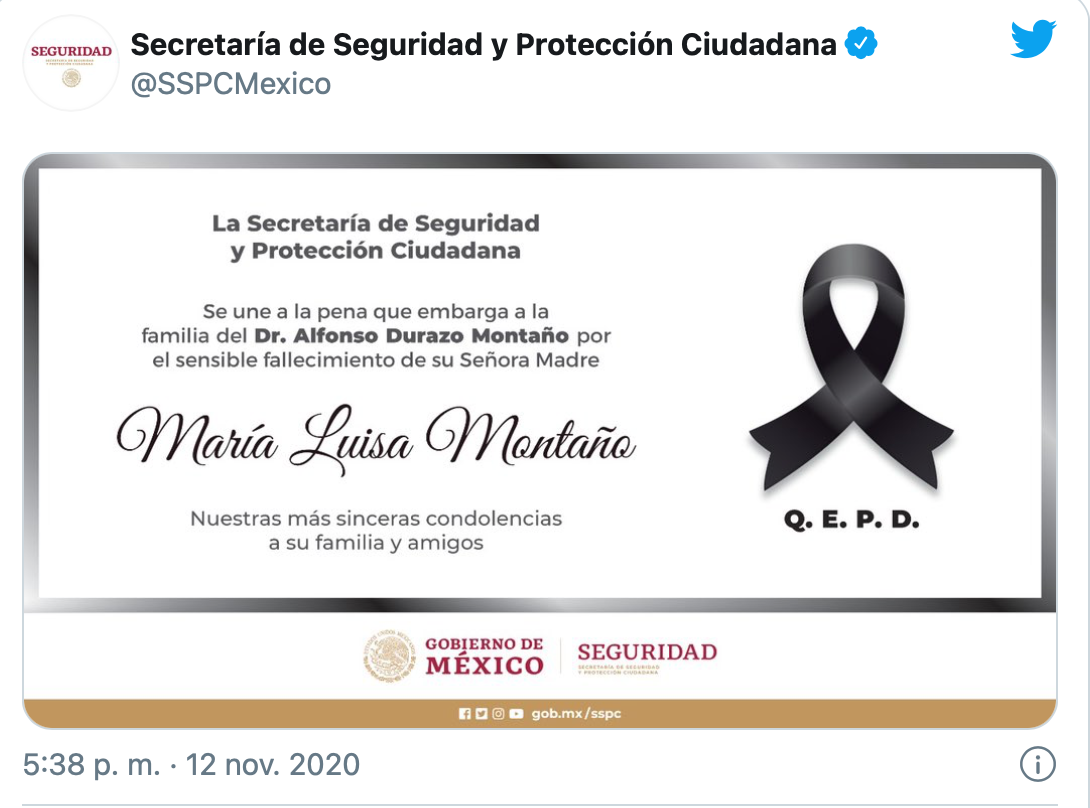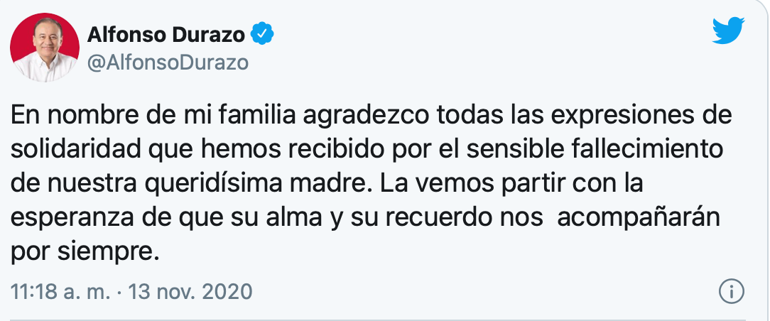 Tras el mensaje, Durazo agradeció en Twitter las muestras de apoyo y amor por el deceso de su mamá.