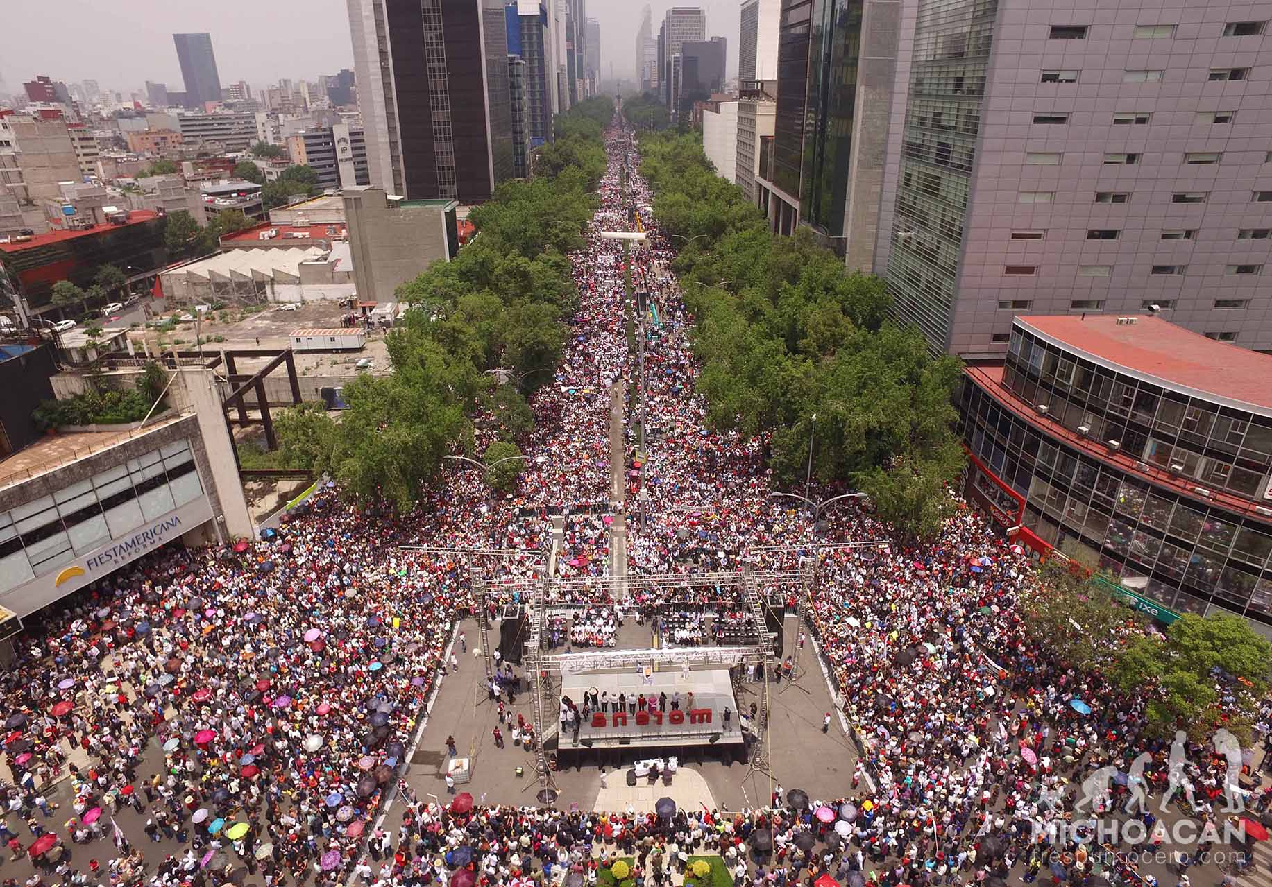 En una de las movilizaciones más numerosas que ha encabezado, y en un discurso que se escuchó a lo largo de Paseo de la Reforma gracias a bocinas montadas en grúas, el dirigente de Morena refirió que el país ha entrado en un proceso preocupante y riesgoso, pero consideró que todavía hay tiempo para una transición ordenada y pacífica, que permita en 2018 al pueblo no sólo elegir a su próximo gobierno, sino la política que más convenga.