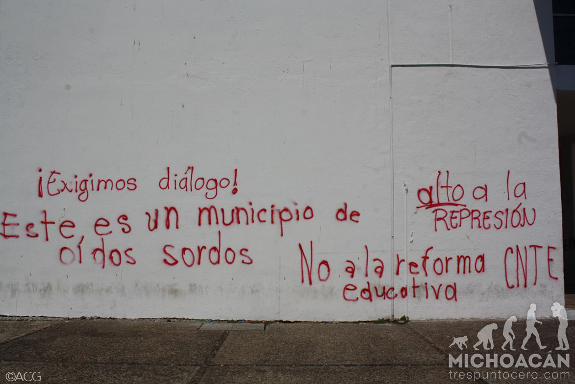 “Exigimos diálogo, este es un municipio de oídos sordos, no a la reforma educativa” , “Alto a la represión”, son algunas de las consignas que los maestros escribieron en las paredes del Ayuntamiento.