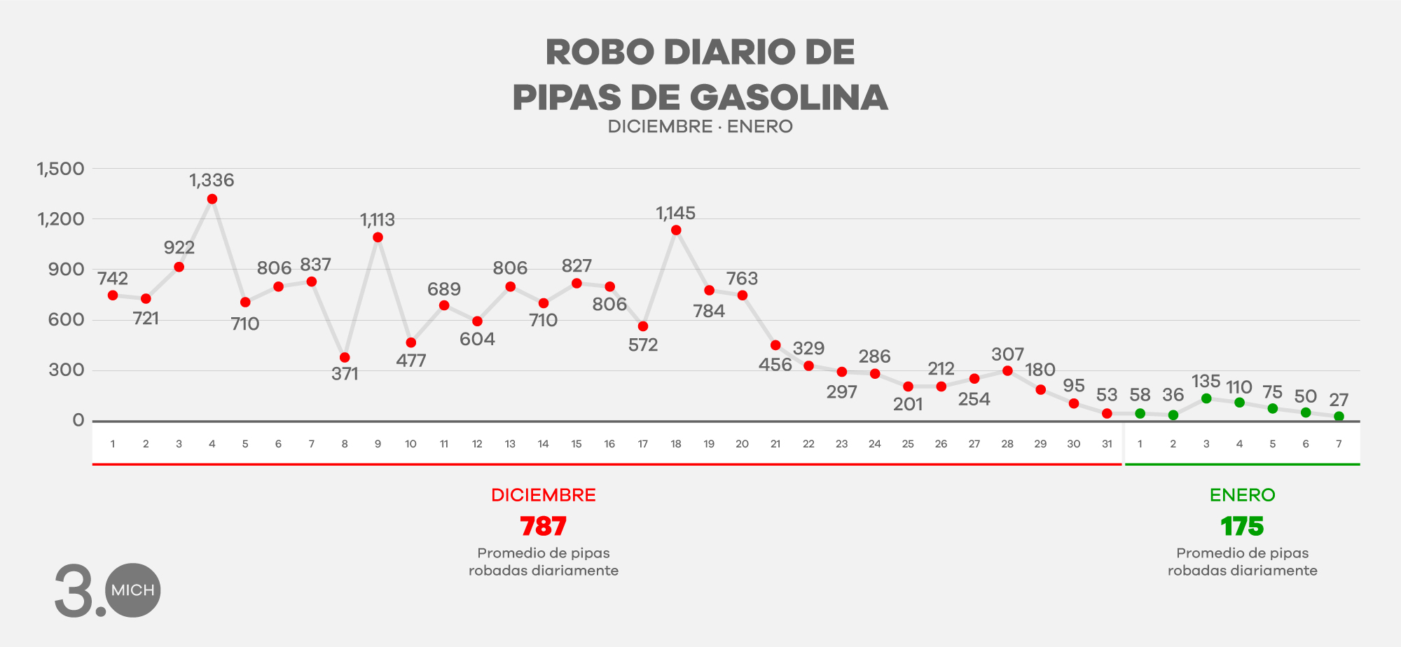 En rueda de prensa matutina, el mandatario mexicano informó que el lunes 7 de enero es cuando menos pipas se han robado, al pasar de 1000 a 27 diarias, por lo que lo calificó como “un día especial”.