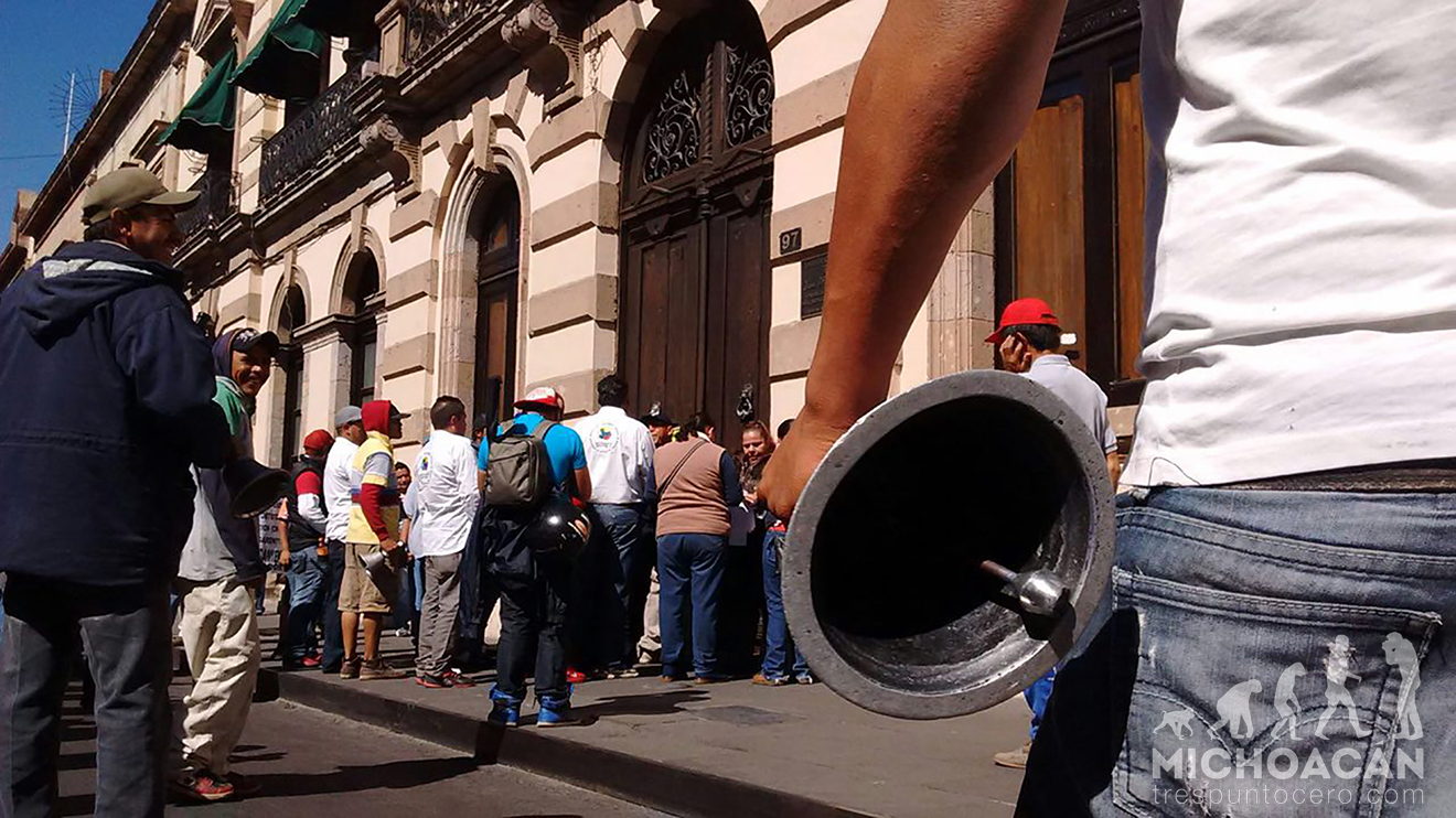 Morelia, Michoacán.-Trabajadores dedicados a la recolección de basura en compañía de taxistas, que se movilizaron de la Calzada la Huerta al Centro Histórico arribaron al Congreso del Estado en protesta al reemplacamiento.