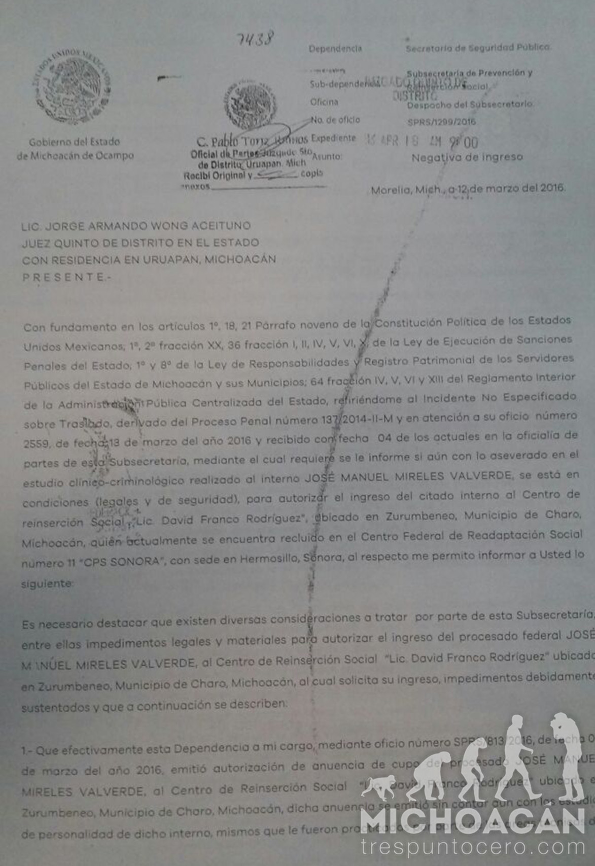La respuesta fue turnada al juez Quinto de Distrito del Estado, con residencia en Uruapan, Jorge Armando Wong Aceituno, y es una negativa de ingreso.