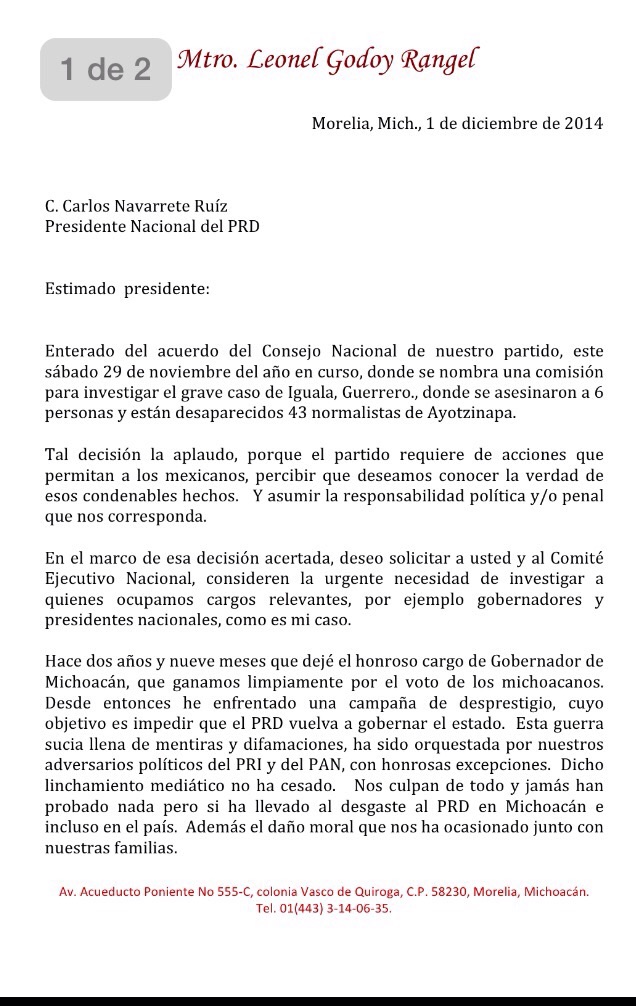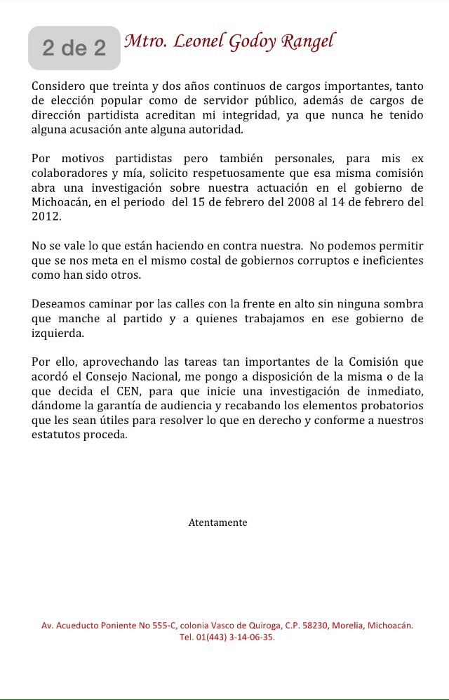 Morelia, Michoacán.- El ex gobernador de Michoacán, Leonel Godoy Rangel envío una carta dirigida al presidente del Partido de la Revolución Democrática (PRD), Carlos Navarrete Ruiz, con la finalidad de que se investigue el actuar de su gobierno, durante el periodo del 15 de febrero del 2008 al 14 de febrero de 2012 en Michoacán.