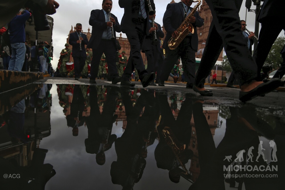 Al frente, una banda de guerra de la XXI Zona Militar con paso marcial y una limpia ejecución abría el paso a una comitiva de funcionarios que parecían solazarse, sonrientes, del escenario a su disposición, la avenida principal de la capital estatal a su servicio.