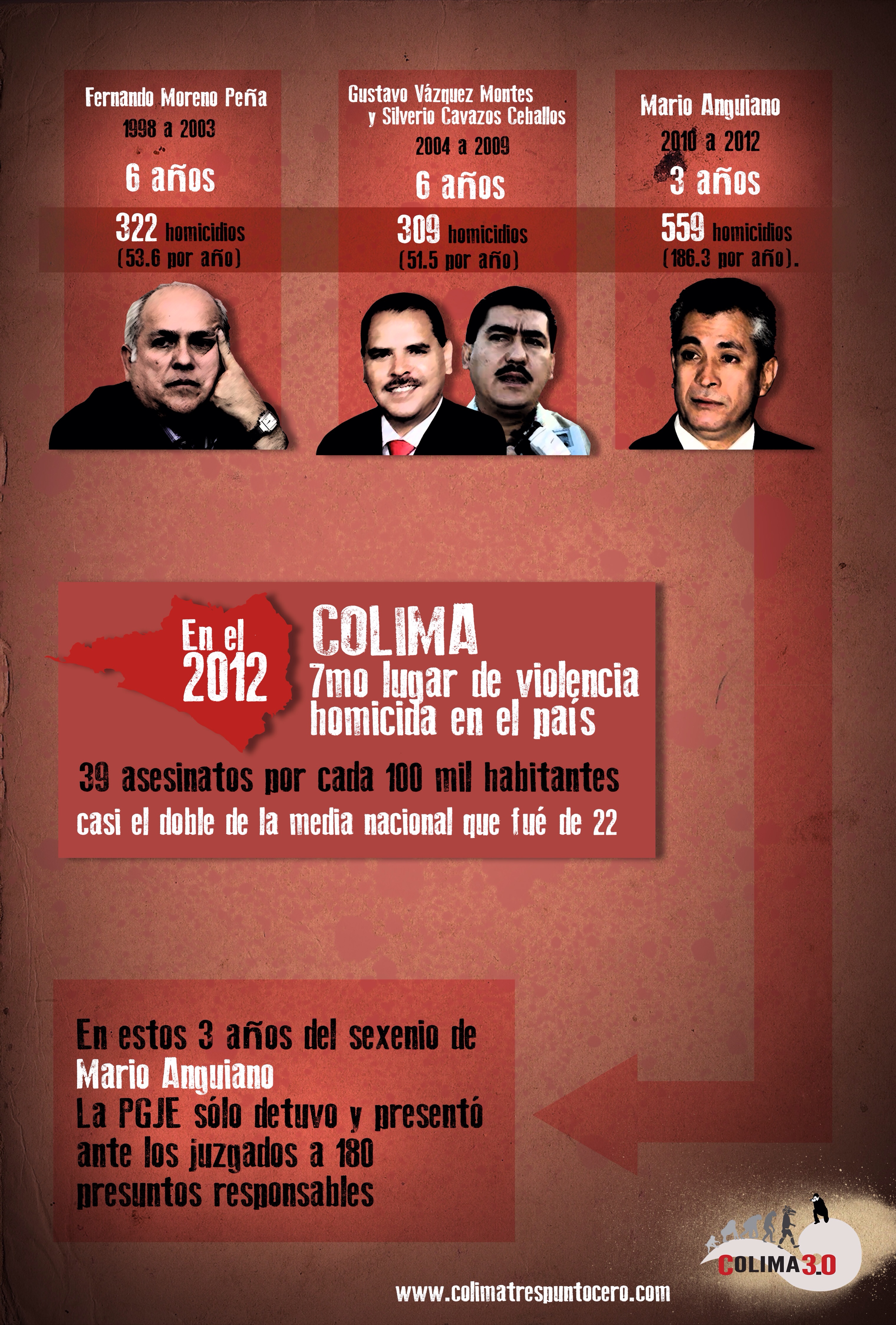 Según el Inegi, en 2012 Colima se colocó en el séptimo lugar de violencia homicida en el país, con una tasa de 39 asesinatos por cada 100 mil habitantes —casi el doble de la media nacional, que fue de 22—, sólo debajo de Chihuahua (77), Guerrero (77), Sinaloa (48), Durango (48), Tamaulipas (46) y Coahuila (41).