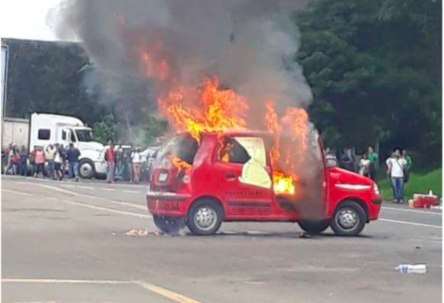 En un primer momento, los manifestantes prendieron fuego a un vehículo compacto color rojo, y continuaron con el bloqueo carretero.