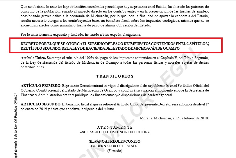 El decreto de Aureoles Conejo con el subsidio del cien por ciento a los impuestos ecológicos, fue publicado el pasado jueves 14 de febrero en el Periódico Oficial del Estado.