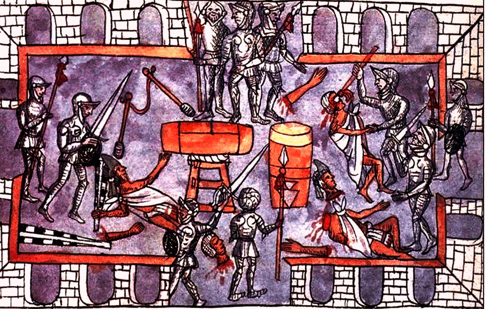 2. Por los asesinados. Porque los conquistadores españoles exterminaron a los pueblos originarios, no sólo al enfermarlos y al volverlos vulnerables a las enfermedades que les transmitieron, sino también literalmente al matarlos de hambre y al hacerlos trabajar hasta caer muertos de agotamiento, y además, lo más importante por la carga de responsabilidad que supone, al masacrar de modo violento a cientos de miles de individuos en uno de los peores genocidios que haya conocido la historia humana. Son tristemente célebres las matanzas de Tóxcatl y de Cholula contra indígenas desprevenidos, confiados y engañados, pero constituyen tan sólo botones de muestra de una escena que se repite una y otra vez durante la conquista. Los conquistadores no dejaron de asesinar a traición y con trampas infames a gente frecuentemente pacífica, hospitalaria y con un alto sentido ético y del honor. Aunque hubiera ciertamente hazañas militares que se debieron a la valentía y la buena estrategia de los conquistadores, el aspecto distintivo de su guerra de conquista fue su propensión a entrampar y traicionar, a comportarse como vulgares criminales y a realizar fáciles y cobardes carnicerías de poblaciones indefensas, de heridos y prisioneros, de hombres desarmados o de mujeres, ancianos y niños, violando así de manera sistemática los códigos morales más elementales de la guerra y ofendiendo tanto nuestra sensibilidad como la del siglo XVI.