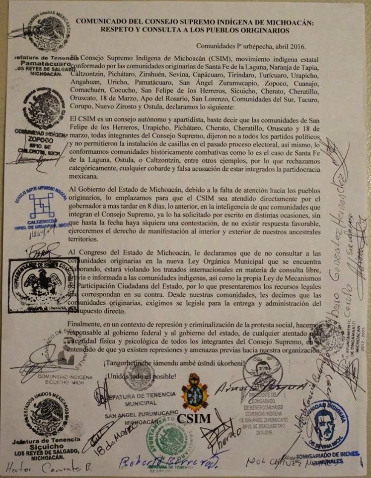 El Consejo Supremo Indígena de Michoacán (CSIM), movimiento indígena estatal conformado por las comunidades originarias de Santa Fe de la Laguna, Naranja de Tapia, Caltzontzin, Pichátaro, Zirahuén, Sevina, Capácuaro, Tiríndaro, Turícuaro, Urapicho, Angahuan, Uricho, Pamatácuaro, San Ángel Zurumucapio, Zopoco, Cuanajo, Comachuén, Cocucho, San Felipe de los Herreros, Sicuicho, Cherato, Cheratillo, Oruscato, 18 de Marzo, Apo del Rosario, San Lorenzo, Comunidades del Sur, Tacuro, Corupo, Nuevo Zirosto y Ostula, declaramos lo siguiente: