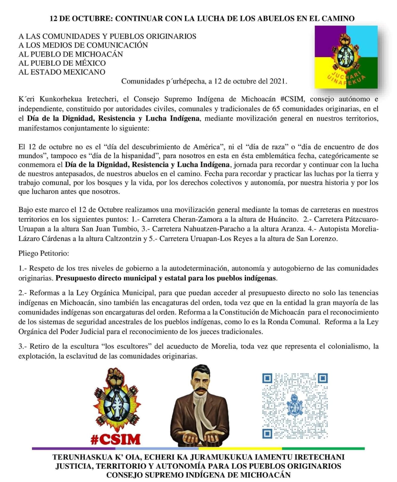 Las peticiones son: Respeto a la autonomía indígena en todos sus niveles, incluido el autogobierno y el presupuesto directo; una reforma a la Ley Orgánica Municipal para garantizar el presupuesto directo a las comunidades indígenas y por último, el retiro del monumento a Los Constructores de Morelia por parte de las autoridades municipales.