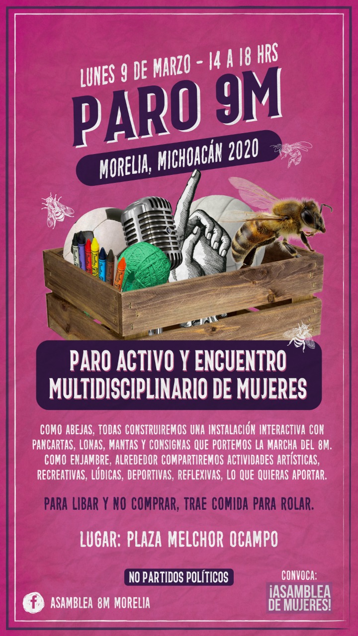 En el marco del Día Internacional de la Mujer y la convocatoria que se ha hecho a nivel nacional de un paro nacional de mujeres el 9 de marzo, la asamblea 8M Morelia convoca a sumarse al movimiento con un paro activo el mismo día.