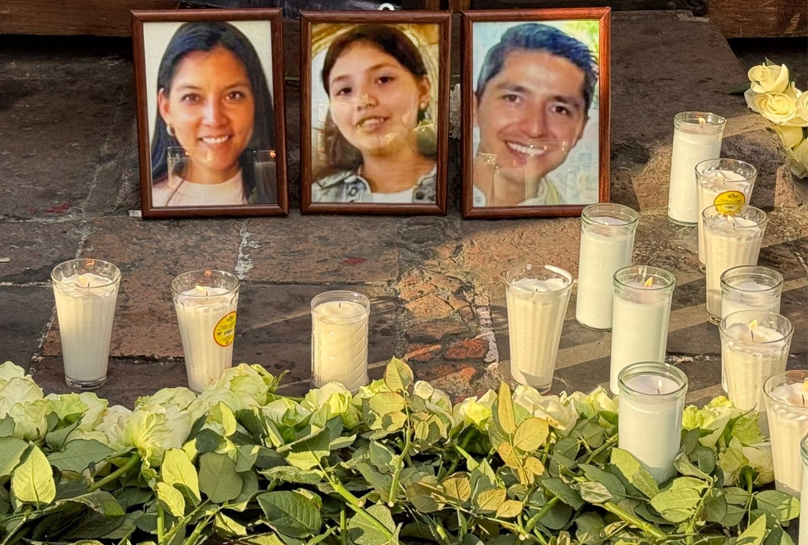 Los rostros de Víctor, Anayeli y Megan, fueron colocados en la puerta principal de Palacio de Gobierno, junto a una cruz de rosas blancas y decenas de velas, en memoria de las víctimas.