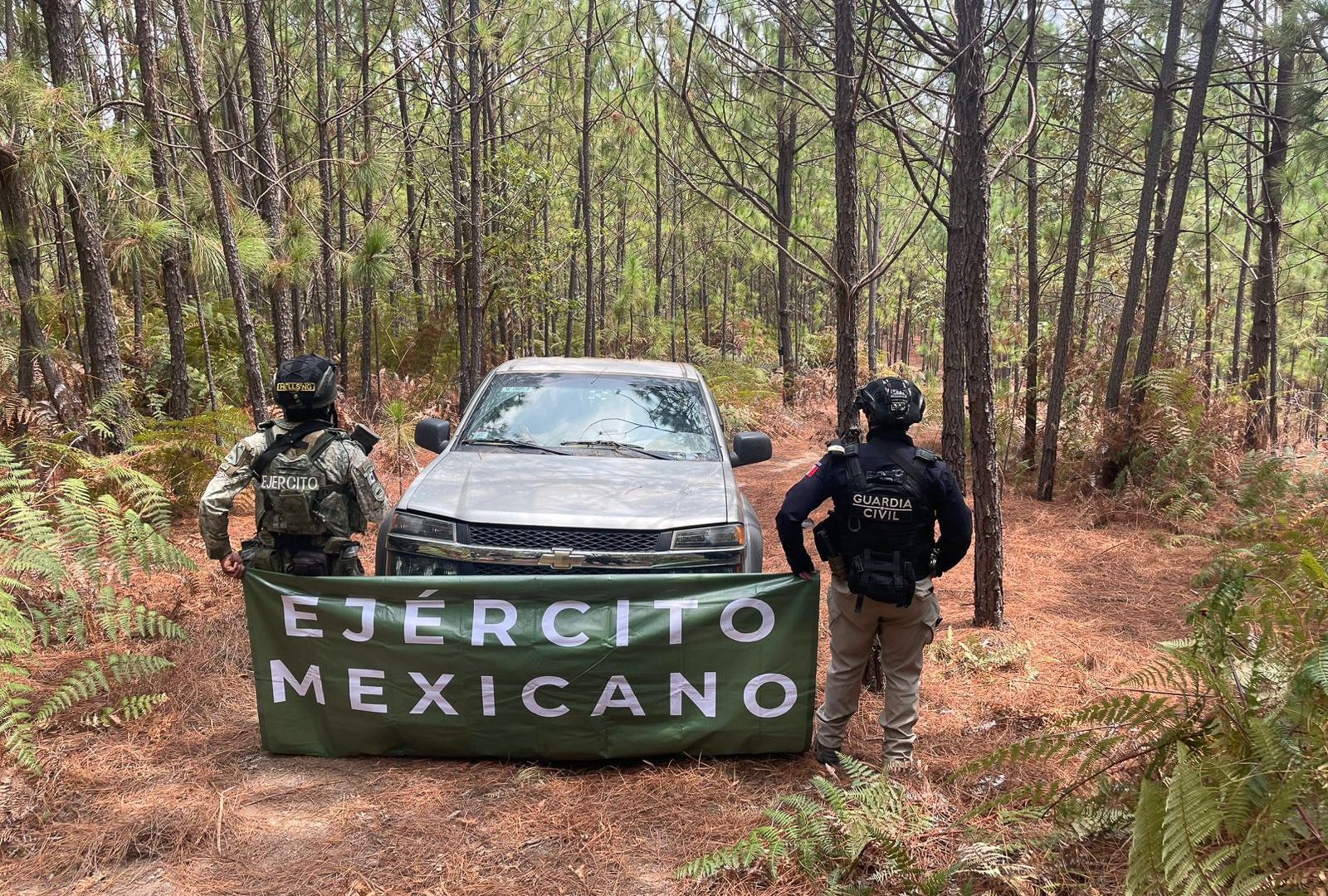 En seguimiento a las labores de vigilancia y disuasión del delito en la localidad de El Olivo, los agentes de la Guardia Civil y el Ejército Mexicano localizaron en una zona de abundante vegetación cuatro unidades de las marcas Chevrolet, Toyota, Jeep y Nissan en aparente estado de abandono, las cuales cuentan con una leyenda alusiva a una célula delictiva.