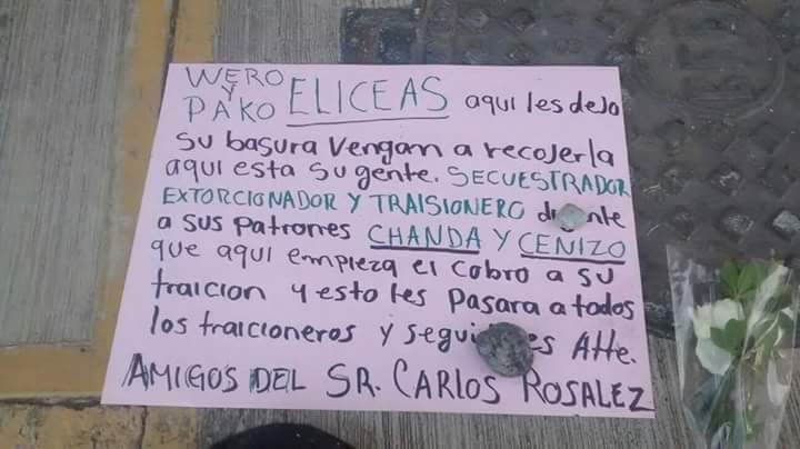 En el mensaje, acusan al hombre que fue asesinado de haber traicionado a sus “patrones” Gilberto Gómez alias ‘El Chanda’ e Ignacio Andrade Rentería alias ‘El Cenizo’. Además de achacarle cargos como secuestro, extorsión y robo.