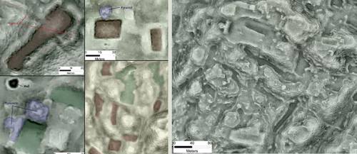 Ejemplos de plazas hundidas, patios y elementos relacionados en Angamuco; a la derecha, imagen de uno de los “barrios” de esa ciudad purépecha, revelado mediante detección de luz y escaneo de rango