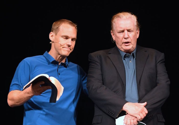 El Presidente no habló a la congregación y se quedó con la cabeza baja mientras el pastor David Platt ofreció una oración por los 12 muertos de la terrible masacre.