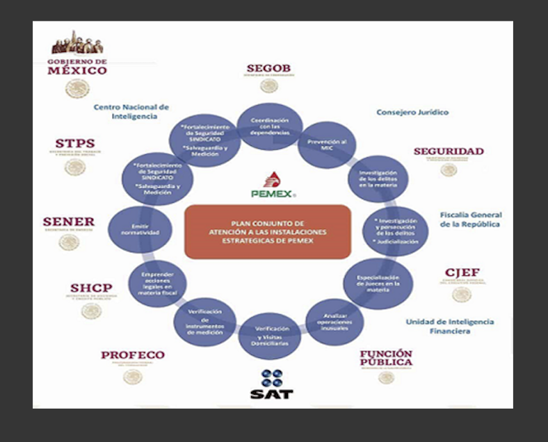 Explicó que el Plan consiste en que la Secretaría de Marina y el Ejército Nacional desplegaron 4 mil efectivos en 58 instalaciones de 15 sistemas de distribución de Pemex, que incluye seis refinerías, 39 terminales de abastecimiento y 12 estaciones de bombeo, así como un trabajo conjunto entre dependencias públicas, que incluye desde el SAT, hasta la Secretaria de Gobernación, no solo para evitar el robo sino para encontrar a los culpables.