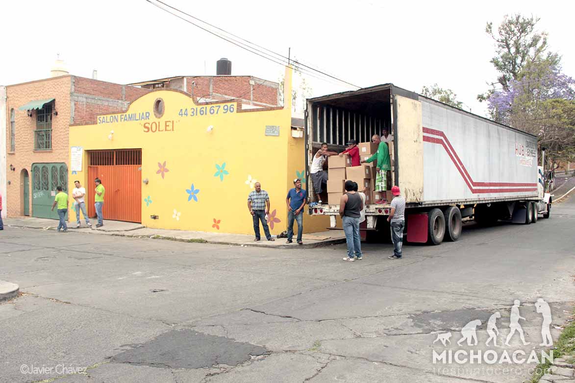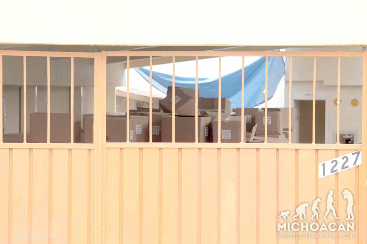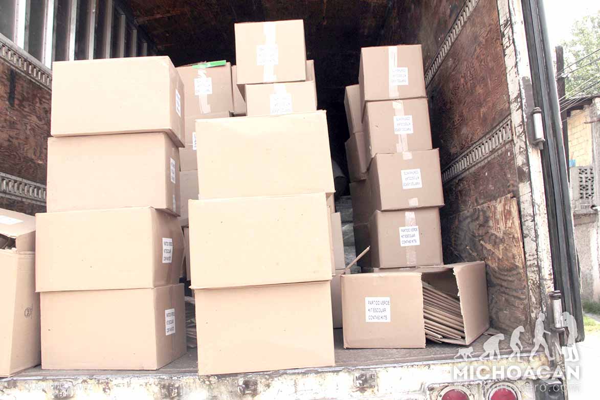 Morelia, Michoacán.-Miles de paquetes de útiles escolares del Partido Verde Ecologista de México fueron descargados en un salón de la colonia Oviedo Mota; se calcula que son alrededor de 15 toneladas de estos productos y que serían repartidos para favorecer las boletas electorales a favor del PVEM-PRI.