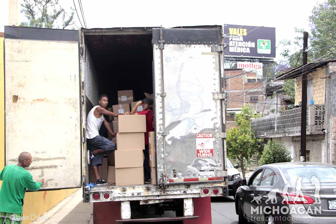 Del tráiler fueron descargadas un promedio de mil cajas, cada una con 60 paquetes de útiles escolares, para lo cual fueron necesarios más de 10 cargadores que suspendieron su actividad cuando personal del IEM se apostó en el lugar.