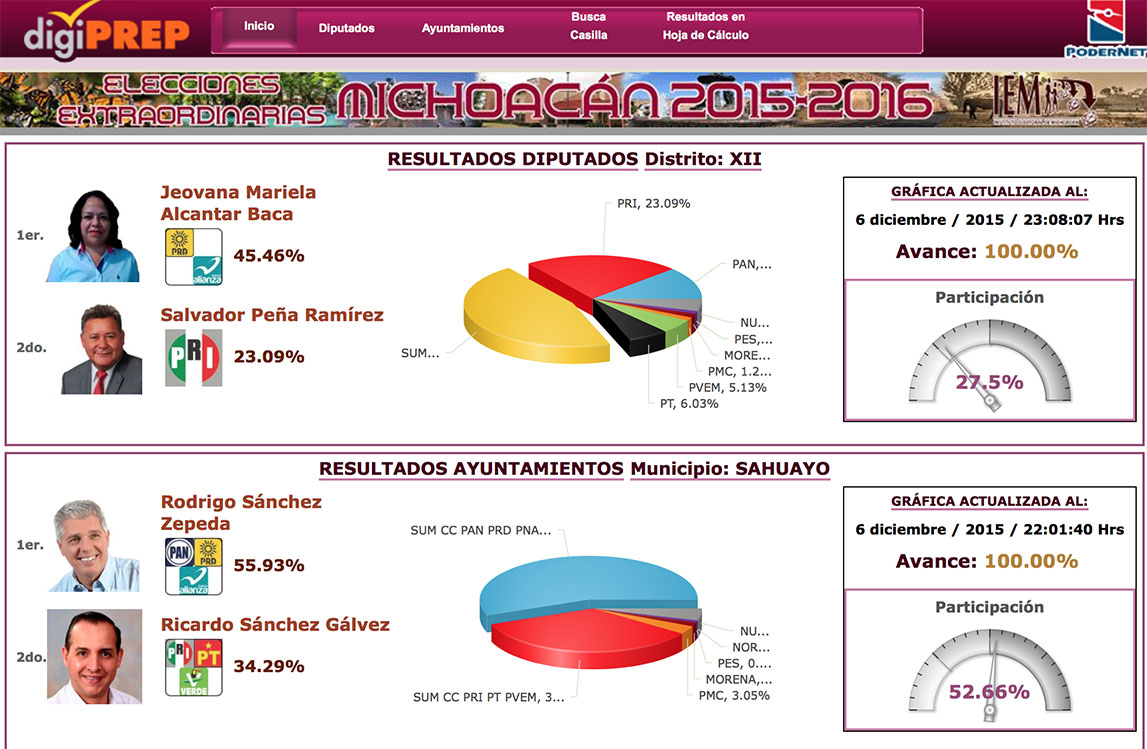 Morelia, Michoacán.-El conteo preliminar de las boletas de la elección extraordinaria realizada este domingo por el Programa de Resultados Electorales Preliminares (PREP) dio el triunfo al Partido Nueva Alianza (PANAL) y Revolución Democrática (PRD) en el Distrito 12 de Hidalgo, y al PAN, PANAL y PRD en el municipio de Sahuayo.