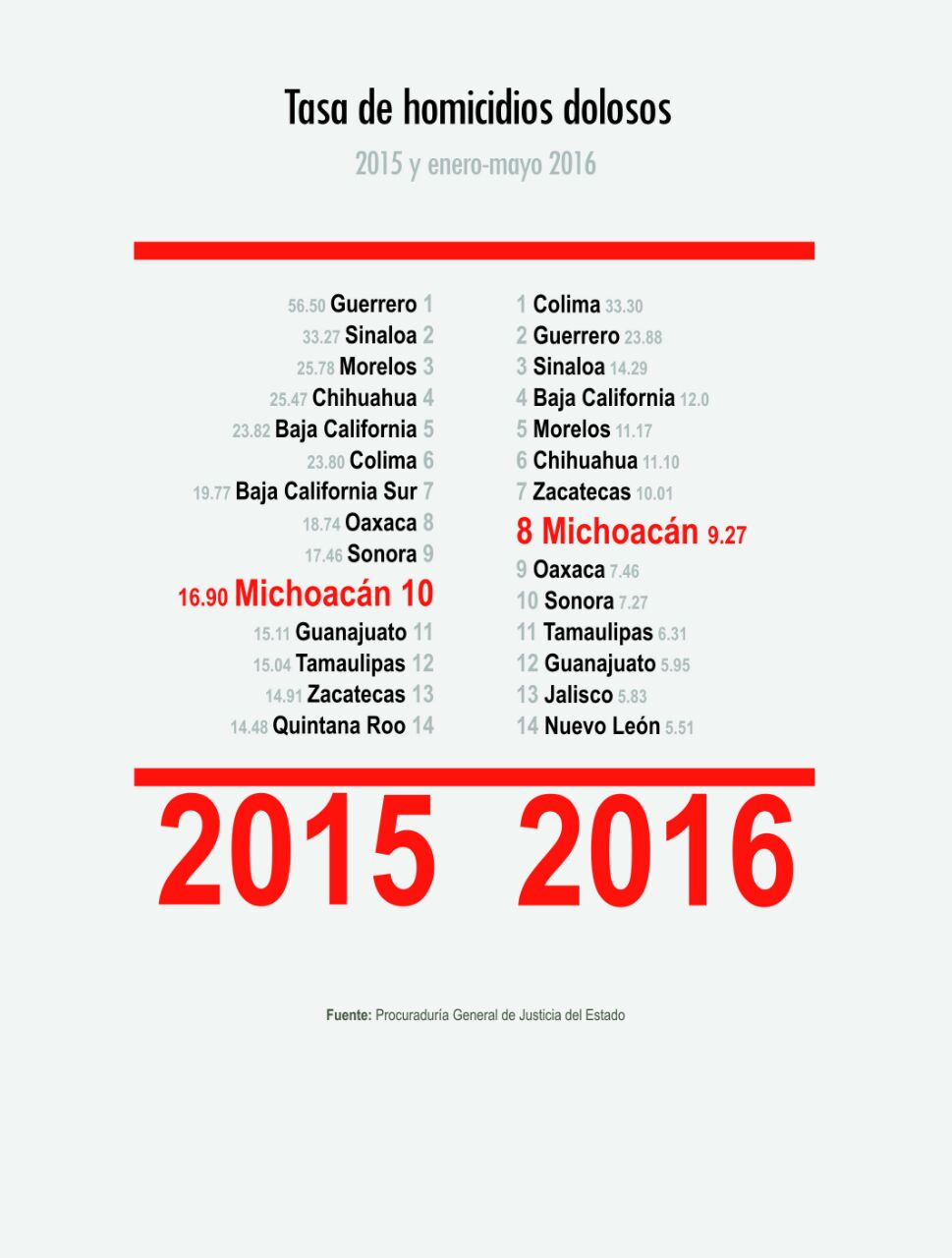 Michoacán pasó del décimo lugar nacional que ocupaba en 2015, al octavo lugar en 2016 en su tasa de homicidios dolosos, esto conforme a la información presentada este miércoles por el procurador Martín Godoy Castro, a los diputados integrantes de las comisiones de Justicia, Derechos Humanos y Seguridad Pública en reunión privada.