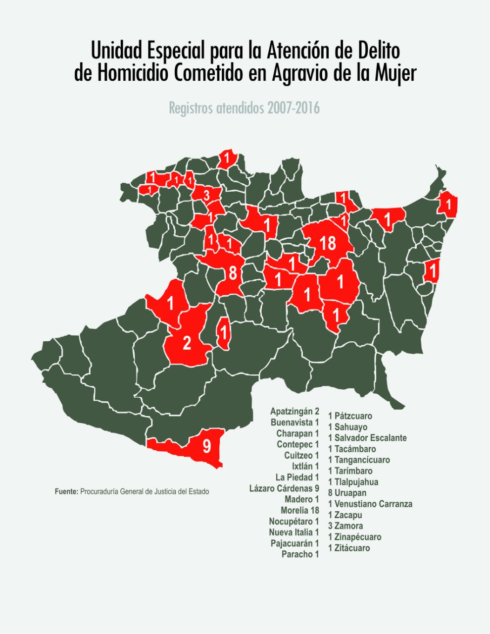 Morelia es el municipio que encabeza la lista de homicidios de mujeres tratados por la Unidad con un total de 18 casos, le sigue Lázaro Cárdenas con nueve, Uruapan con ocho, Zamora con tres, Apatzingán con dos, y con un caso respectivamente están los municipios de Buenavista, Charapan, Contepec, Cuitzeo, Ixtlán, La Piedad, Madero, Nocupétaro, Pajacuarán, Paracho, Pátzcuaro, Sahuayo, Salvador Escalante, Tacámbaro, Tangancícuaro, Tarímbaro, Tlalpujahua, Venustiano Carranza, Zacapu, Zinapécuaro, Zitácuaro, y Nueva Italia en Mújica.