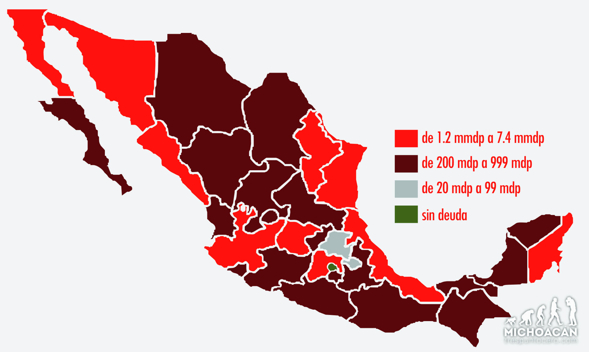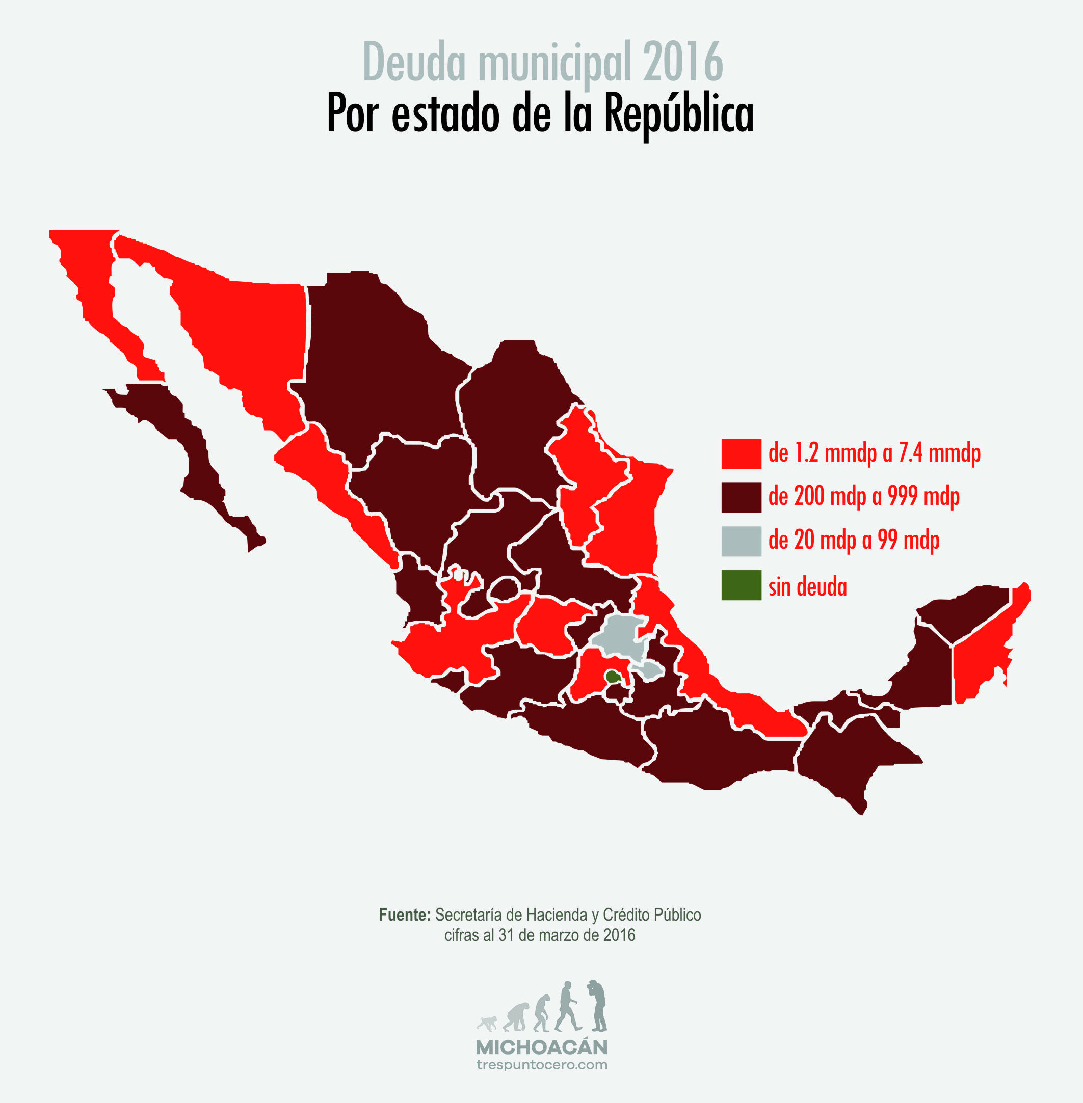 En marzo pasado Michoacán ocupaba el décimo lugar nacional en cuanto a su deuda pública estatal, en contrapartida por la deuda pública municipal su posición en el país era en el lugar número 24, esto conforme a los registros de la Secretaría de Hacienda y Crédito Público (SHCP).