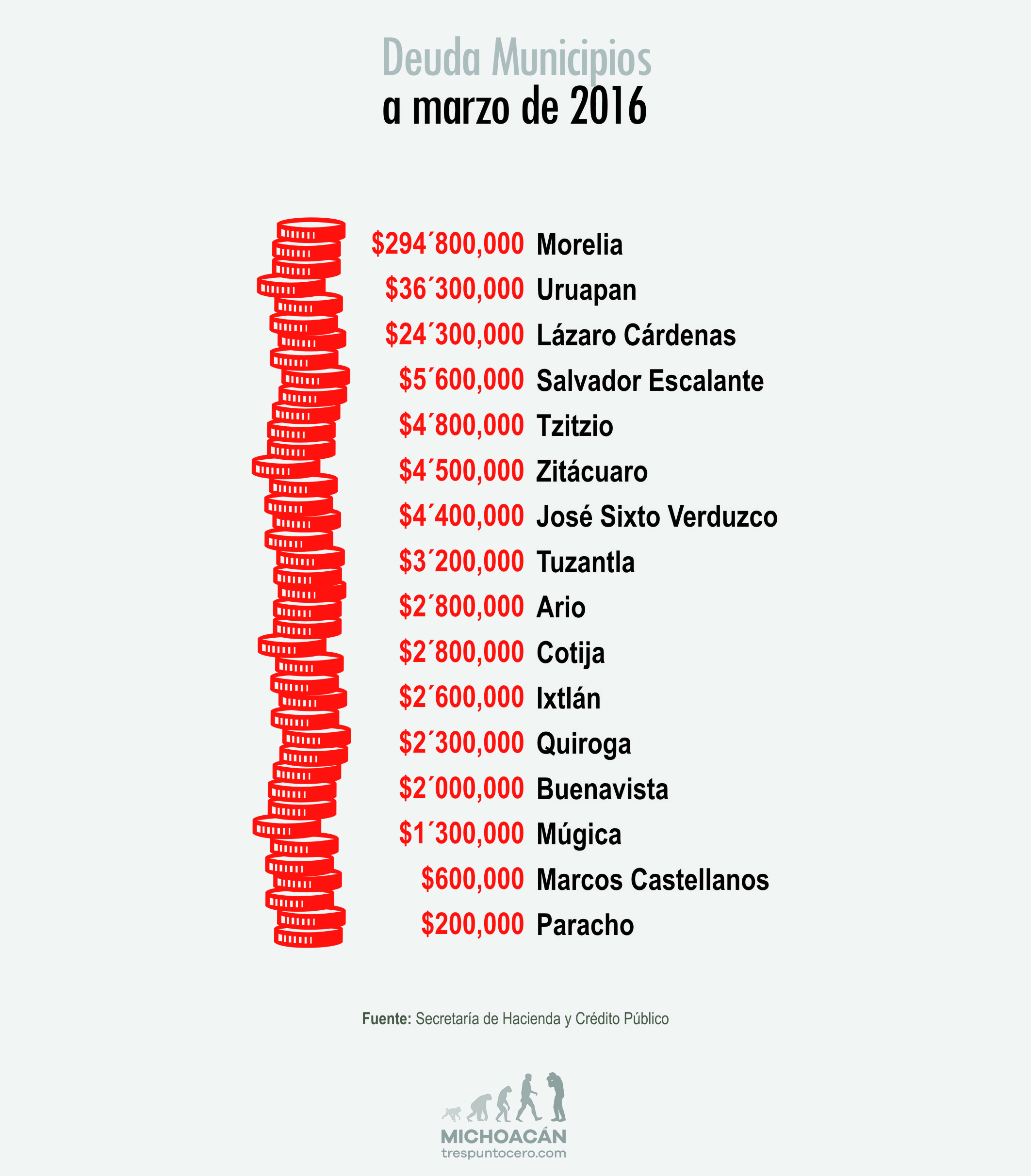 Le sigue Morelia, en donde cada moreliano debe 404.2 pesos producto de la deuda municipal. A la lista sigue Tuzantla, en donde cada habitante debe 196.2 pesos; en Ixtlán son 191.4 pesos; José Sixto Verduzco, 172.03 pesos; en Cotija, 142.5 pesos; en Lázaro Cárdenas, 135.8 pesos; en Salvador Escalante 123.8 pesos; en Uruapan, 115.1 pesos; en Quiroga, 89.8 pesos; en Ario, 80.3 pesos; en Buenavista, 47.3 pesos; en Marcos Castellanos, 46.04 pesos; en Zitácuaro, 28.9 pesos; en Múgica, 28.9 pesos; y en Paracho 5.7 pesos.