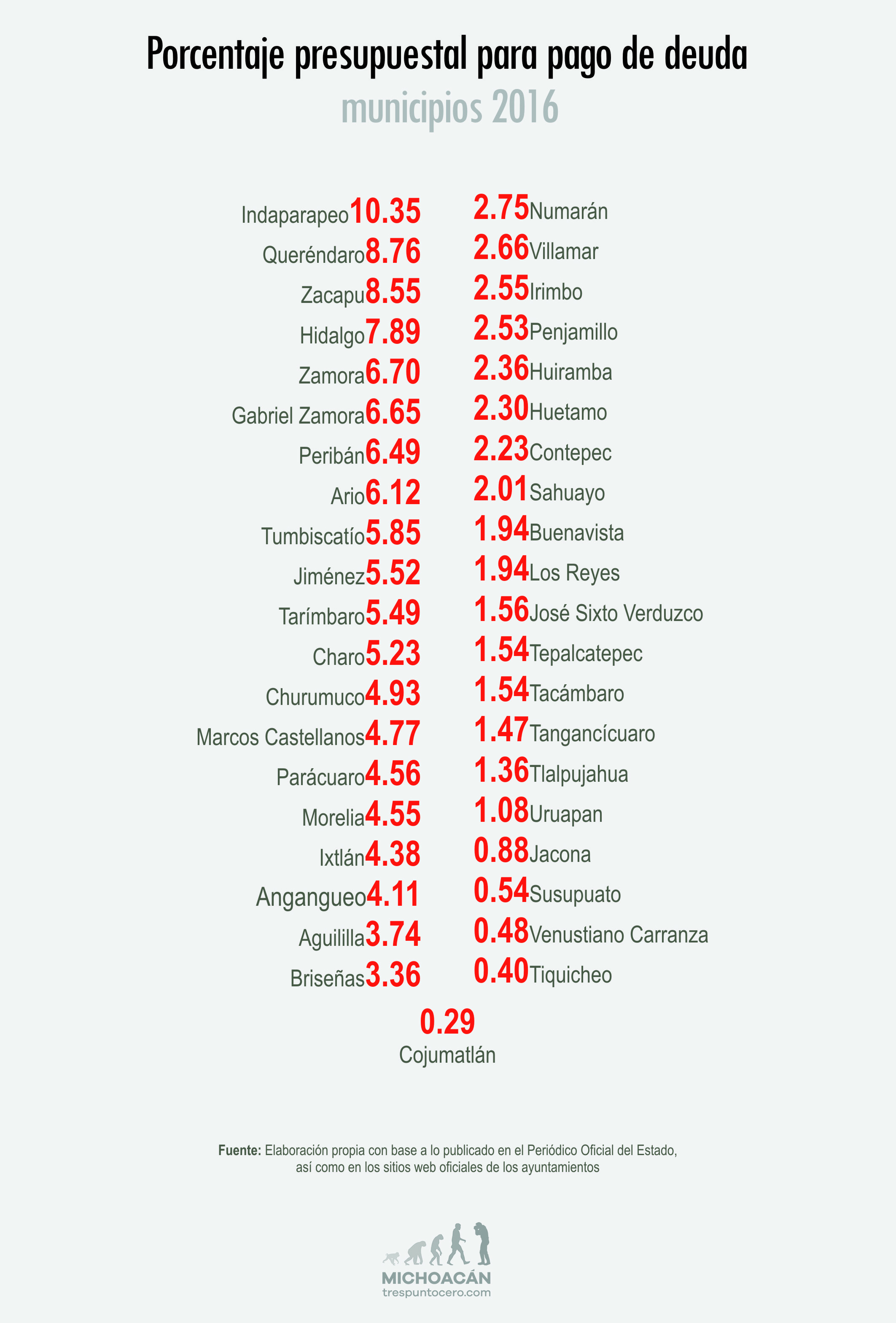 Indaparapeo es el municipio que más porcentaje de su presupuesto destina para el pago de deuda pública, con el 10.35 por ciento del total. A la lista siguen