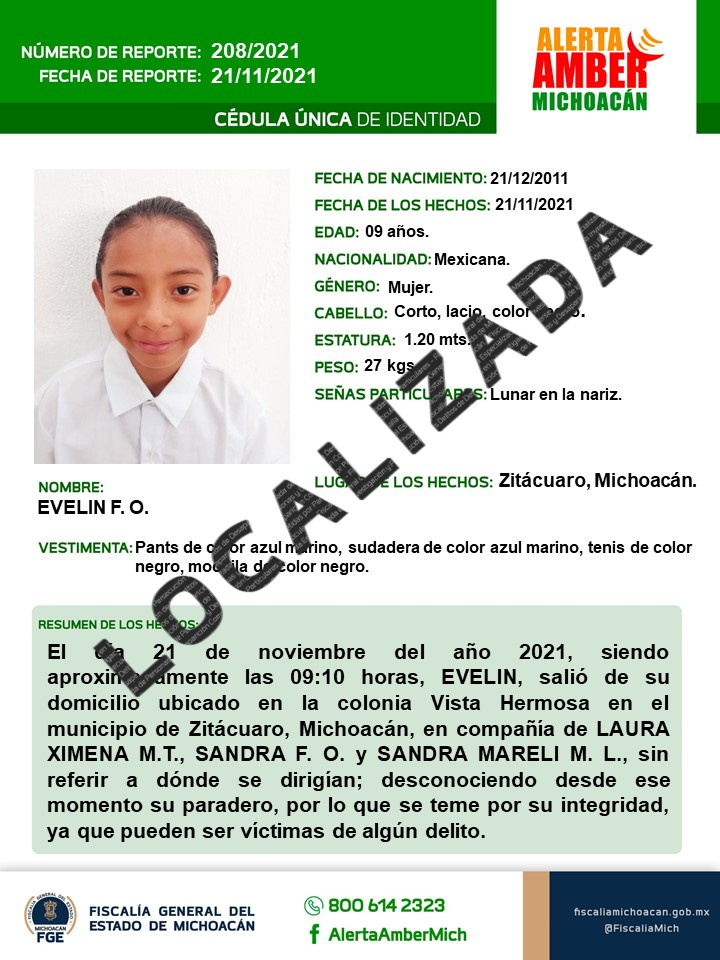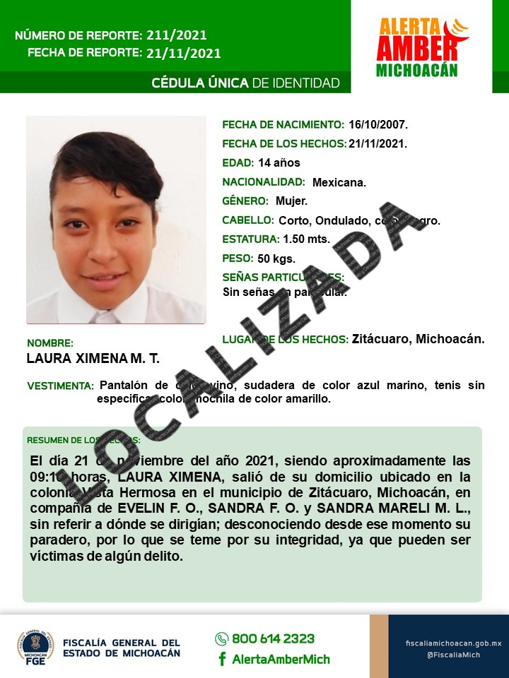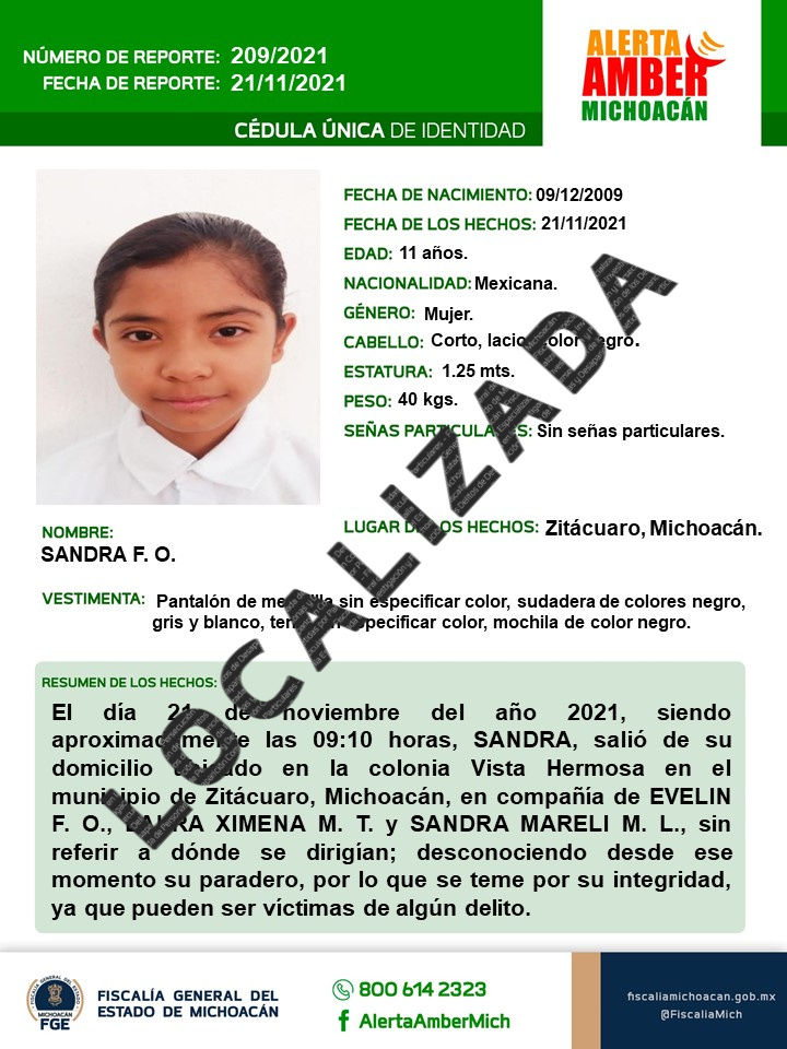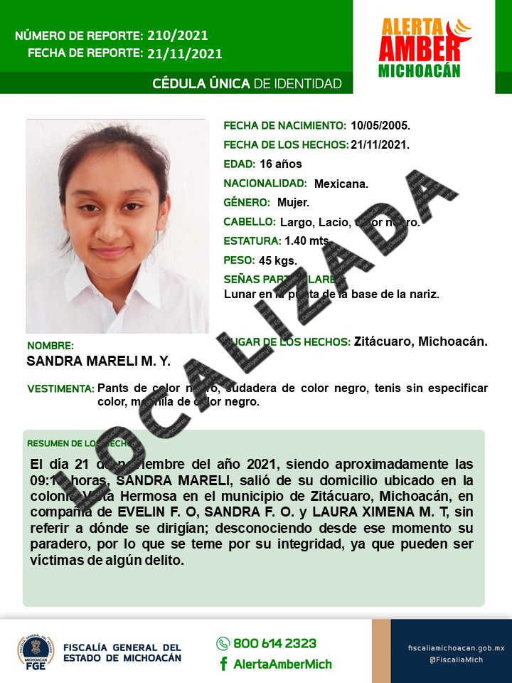 Las menores Sandra Mareli M. Y., de 16 años, Laura Ximena M. T., de 14 años, Sandra F. O., de 11 años y Evelin F. O., de nueve años, salieron el 21 de noviembre de una casa hogar del municipio de Zitácuaro, donde residían, sin dejar rastros de su paradero.