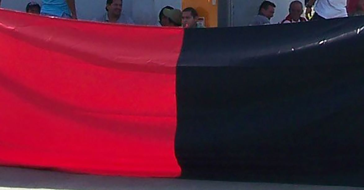Alrededor de las 14:00 horas los trabajadores procedieron a colocar las banderas rojinegras en el inmueble, ante el incumplimiento de pagos de prestaciones y bonos de fin de año.
