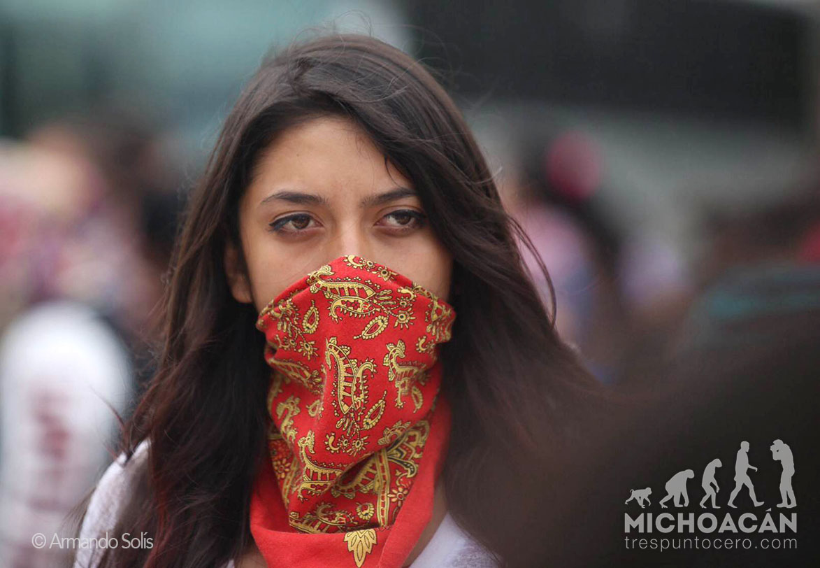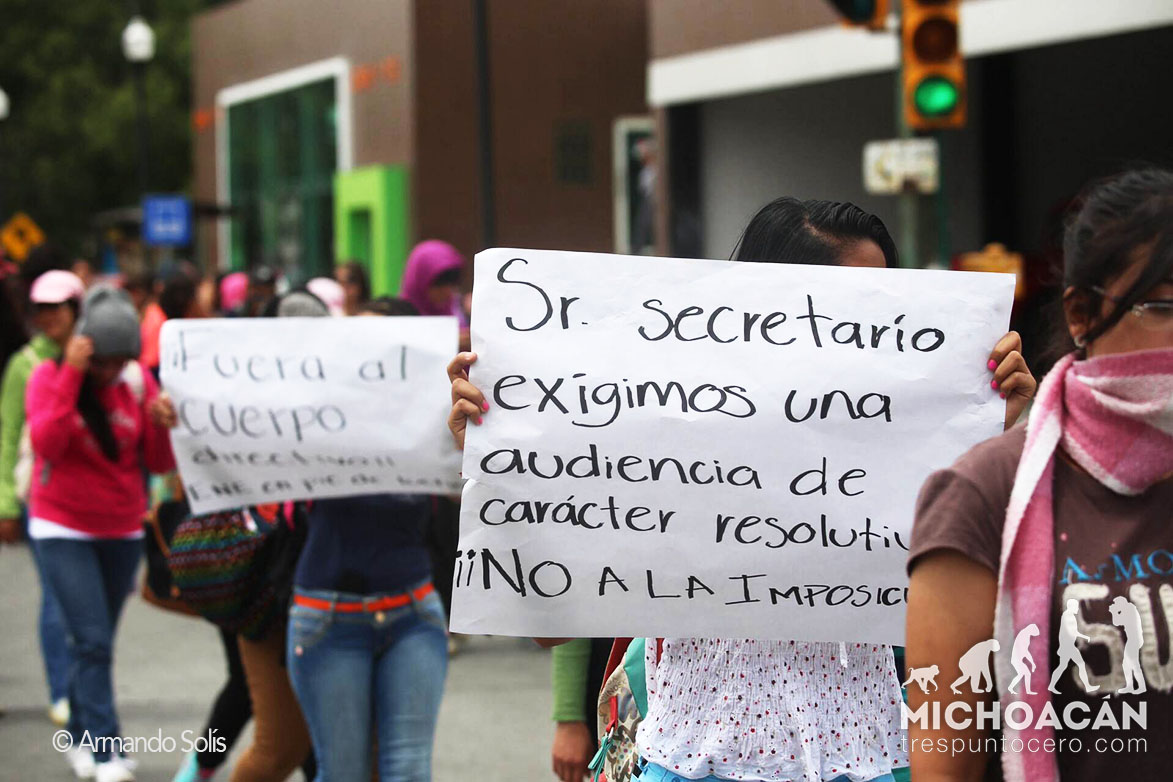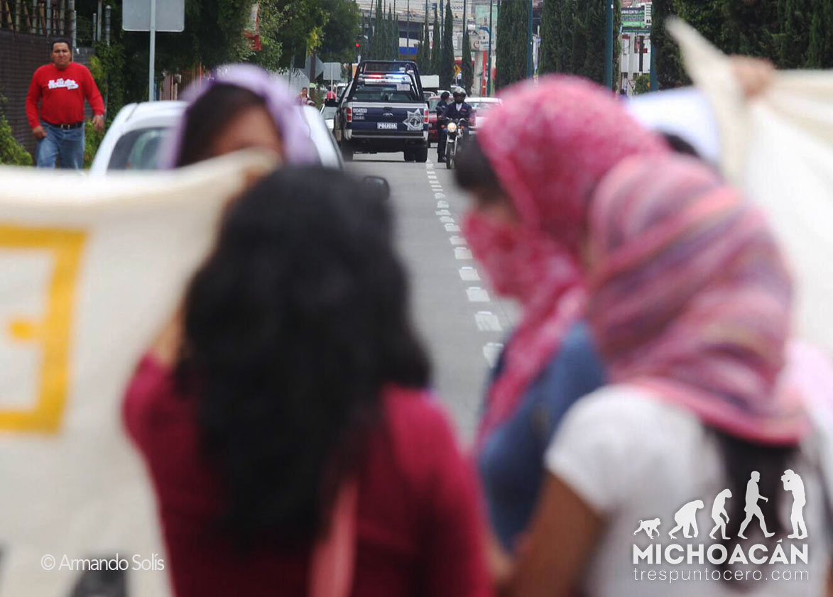 Morelia, Michoacán.- Estudiantes de la Escuela Normal de Educadoras (ENE), así como de la Escuela Normal Rural de Tiripetío marcharon este lunes de nueva cuenta para exigir la destitución del director de la Escuela Normal Superior del Estado de Michoacán Fernando Vázquez García.