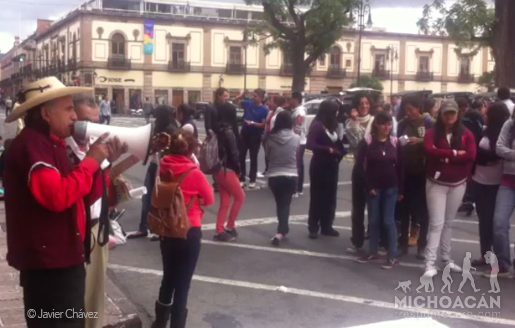 Morelia, Michoacán.-Tras manifestarse en la sede del PAN y Nueva Alianza, los estudiantes intentaron ingresar a la sede del Partido de la Revolución Democrática (PRD), pero al no poder ingresar sólo lanzaron consignas y desistieron de sus acciones.