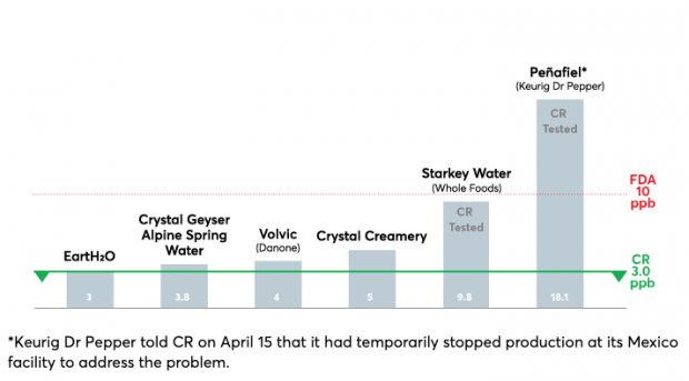 De acuerdo con el estudio de Consumer Reports, de 130 marcas analizadas, seis dieron resultados por encima de 3 partes por billón de arsénico, el cual es el límite recomendado para el agua de ingesta humana.