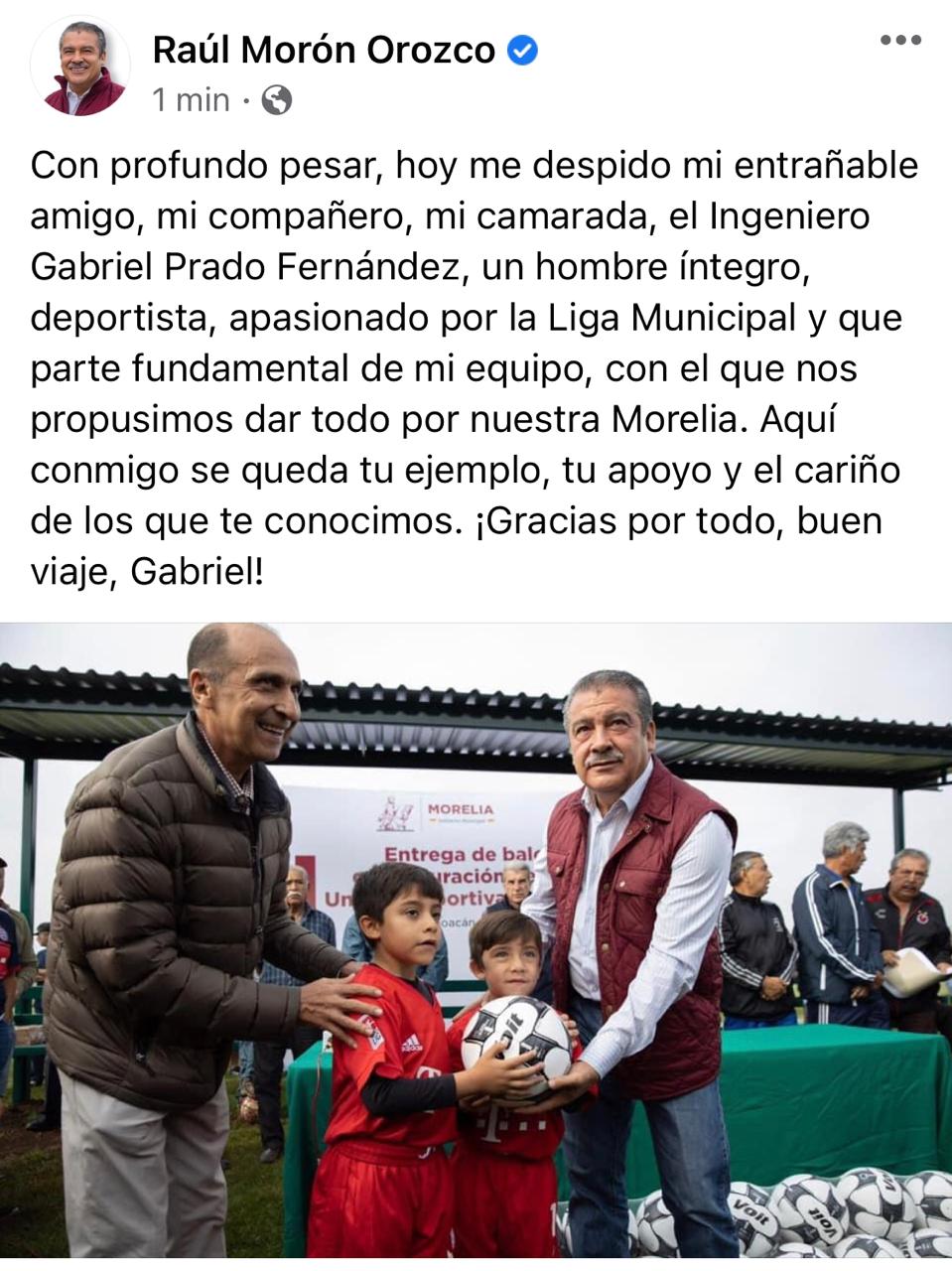 A través de redes sociales, esta mañana el presidente municipal, Raúl Morón Orozco, informó el fallecimiento de Gabriel Prado Fernández, ex secretario de Administración de Morelia.