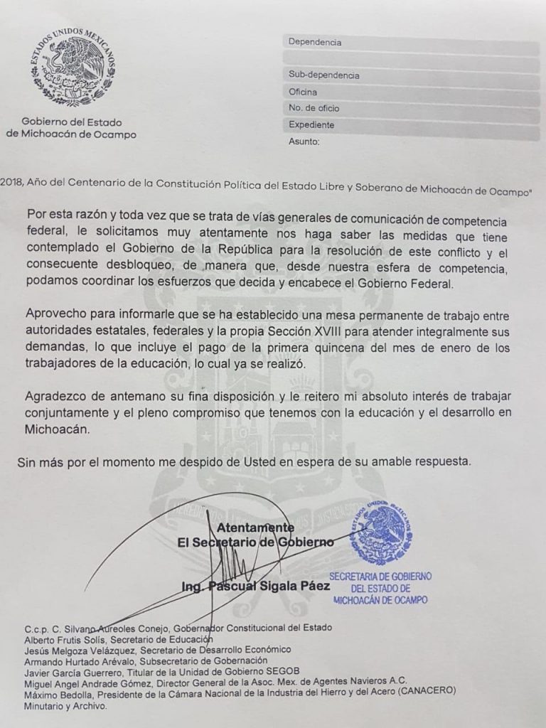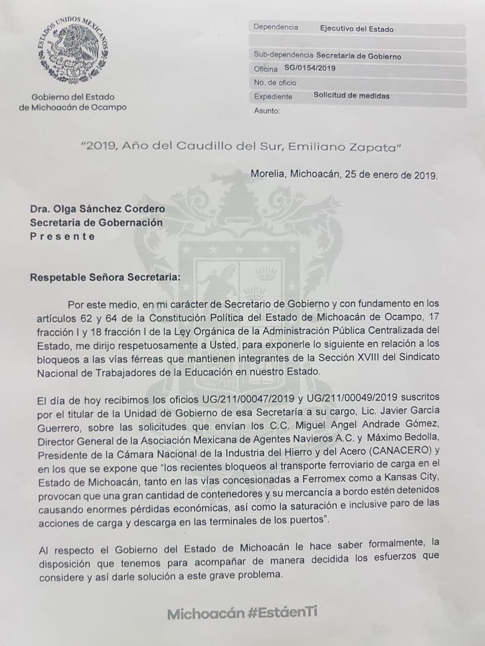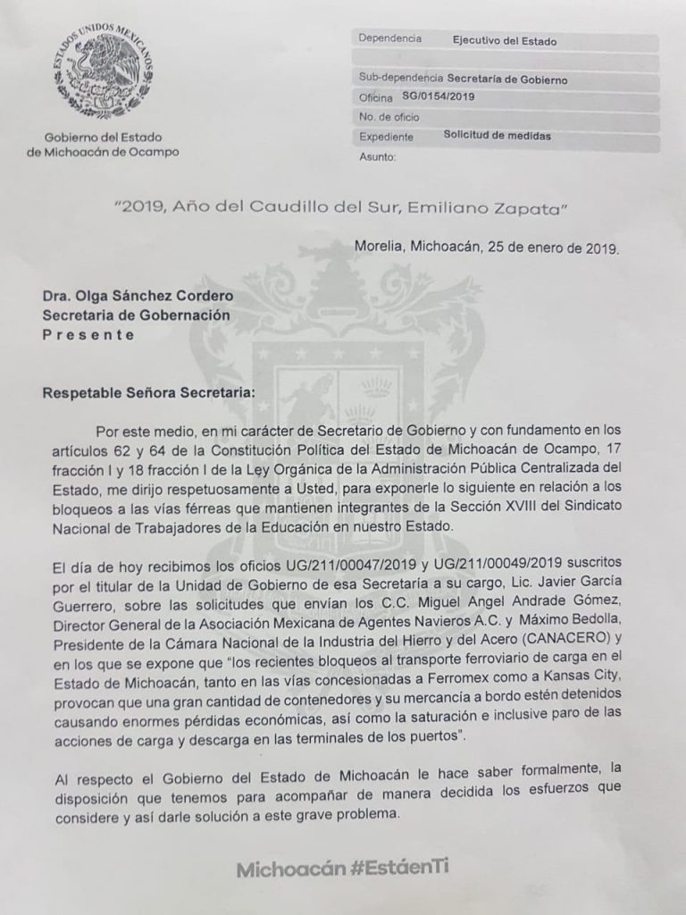 Morelia, Michoacán. El Gobierno de Michoacán solicitó de manera formal al Gobierno de la República la liberación de las vías férreas, las cuales cumplen hoy 12 días obstruidas por el magisterio provocando severas afectaciones económicas y a la vida de las michoacanas y los michoacanos.