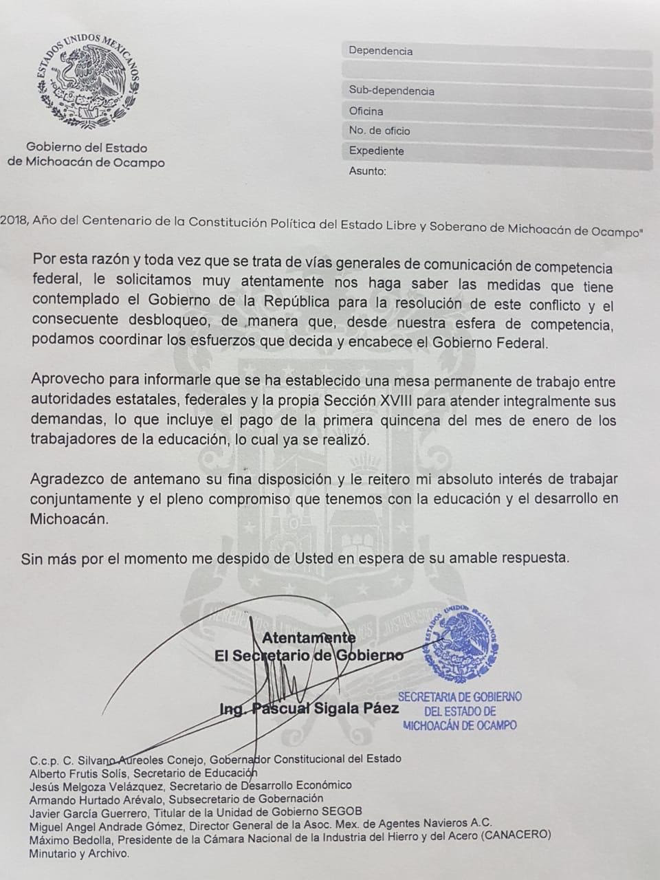 A través de un comunicado de prensa, se informó que en el documento signado por el secretario de Gobierno, Pascual Sigala Páez y dirigido a la secretaria de Gobernación, Olga Sánchez Cordero, la administración estatal reitera su disposición a coadyuvar en las medidas que el Gobierno Federal considere para resolver la problemática.