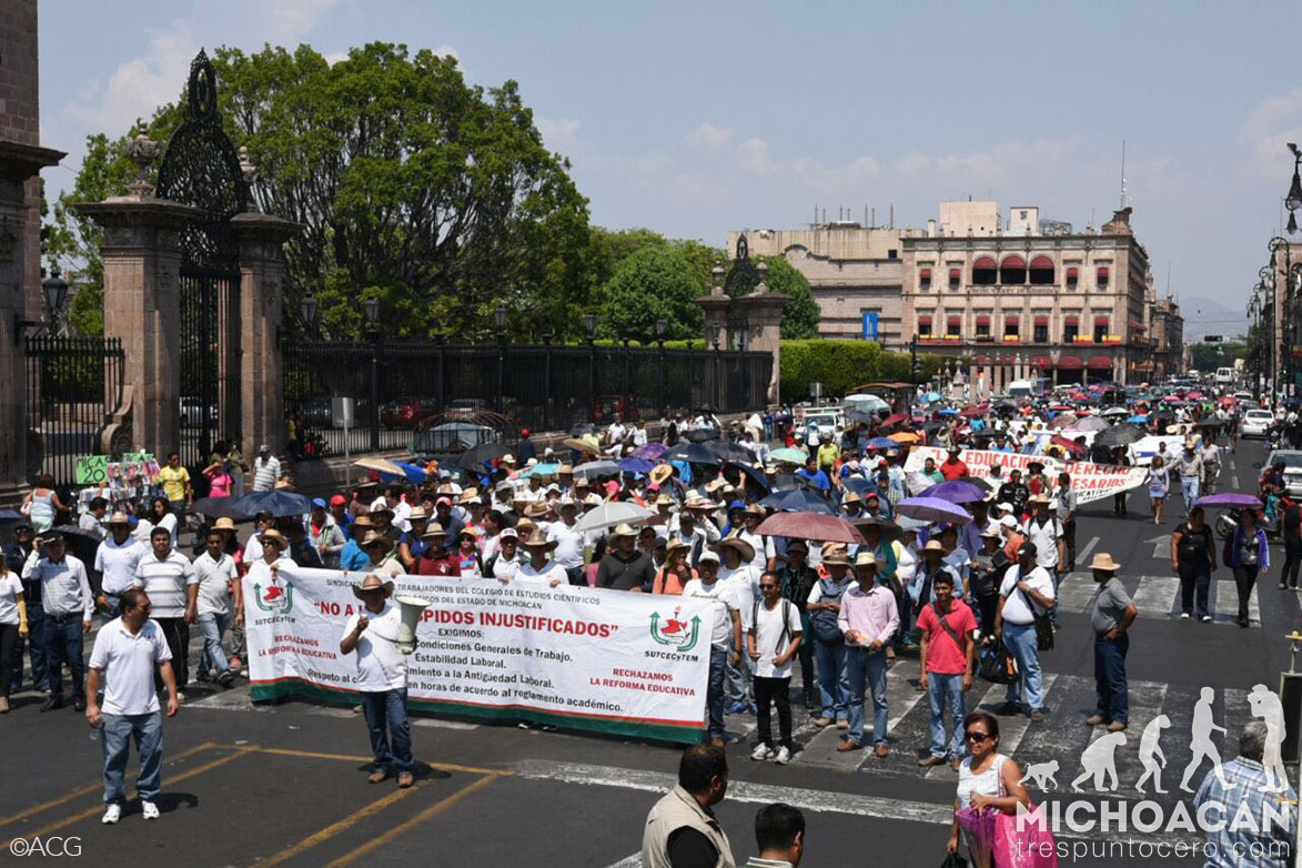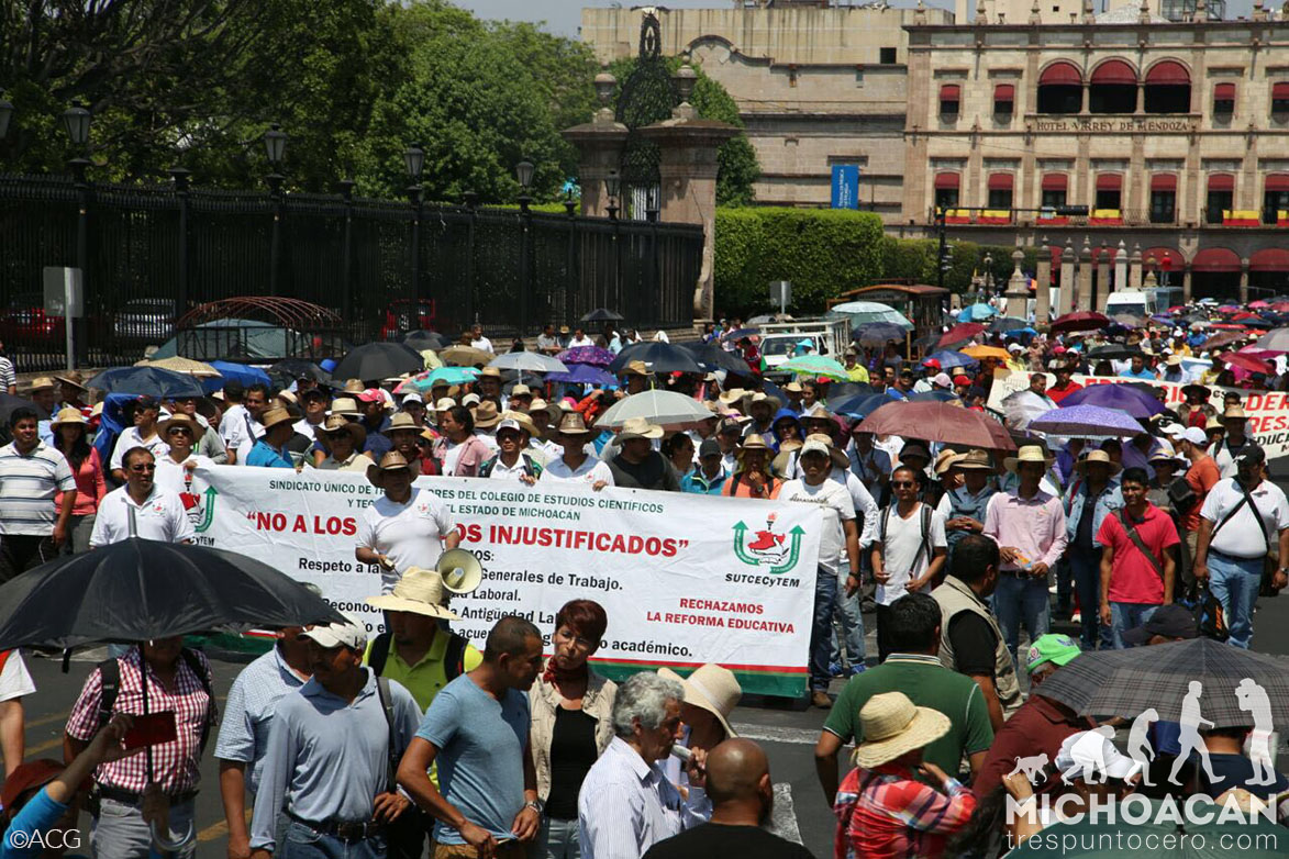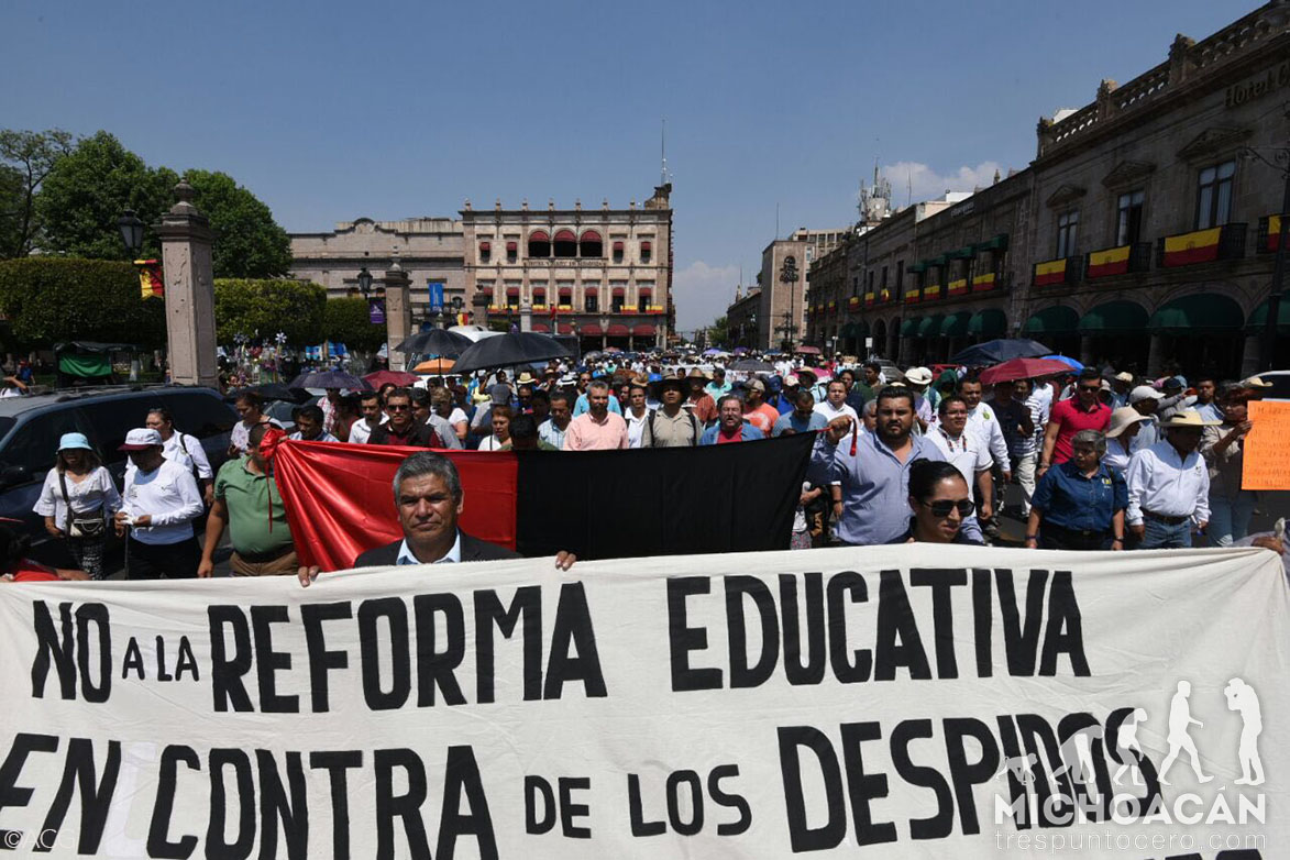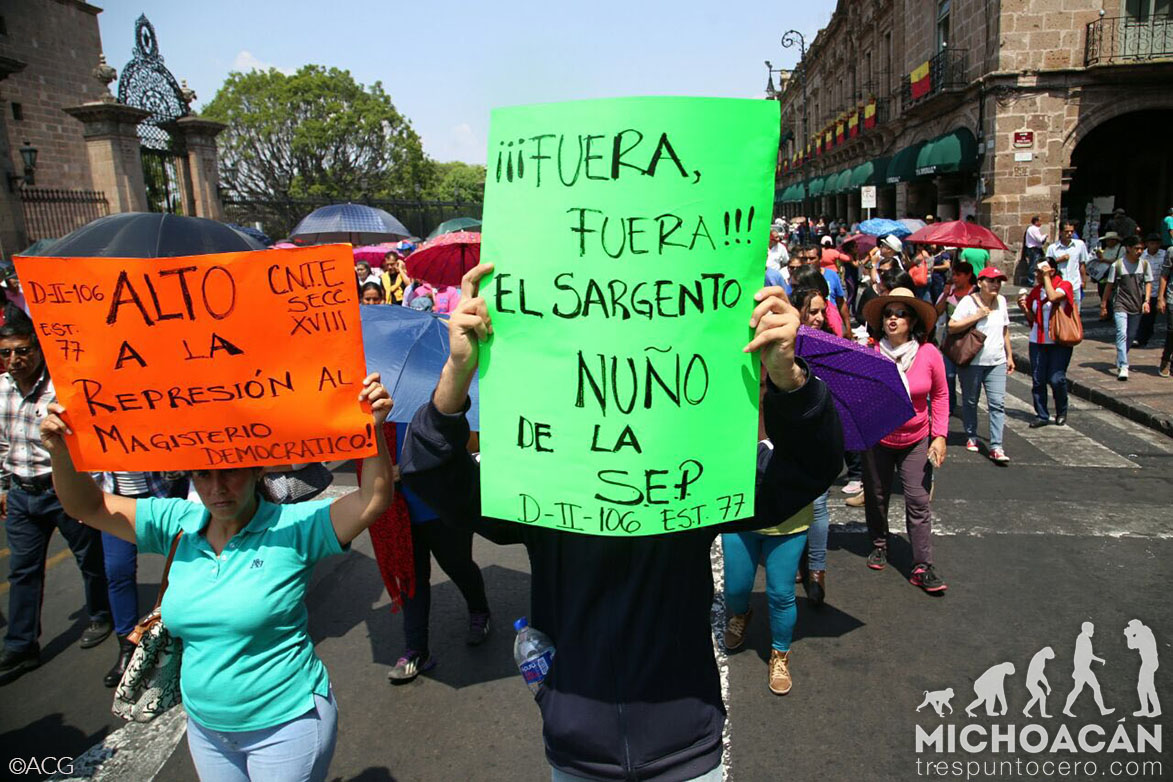 Bajo consignas como “Fuera Nuño”, “alto a la represión”, “no a la Reforma Educativa”, “en contra de los despidos injustificados de docentes”, “ante la represión, la movilización”, “Michoacán no se vende, porque tiene maestros con dignidad”, los sindicalizados partieron de Casa de Gobierno para arribar al Centro Histórico donde realizaron un mitin.
