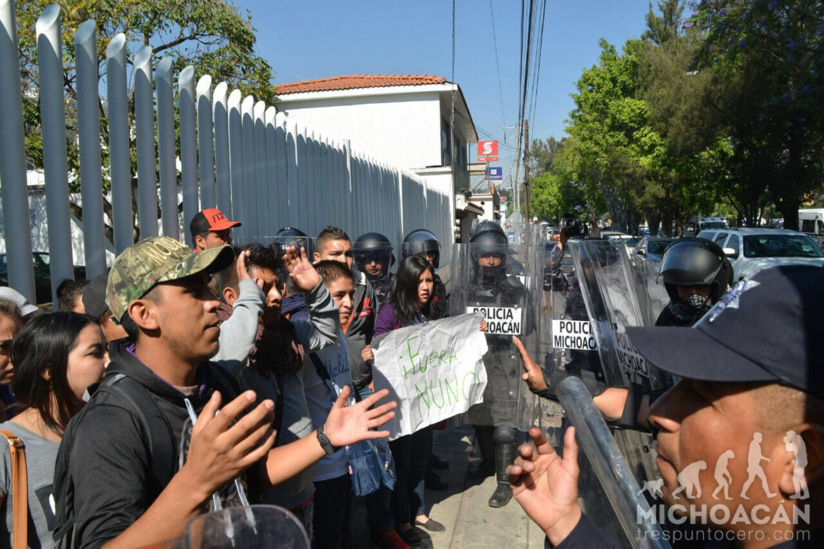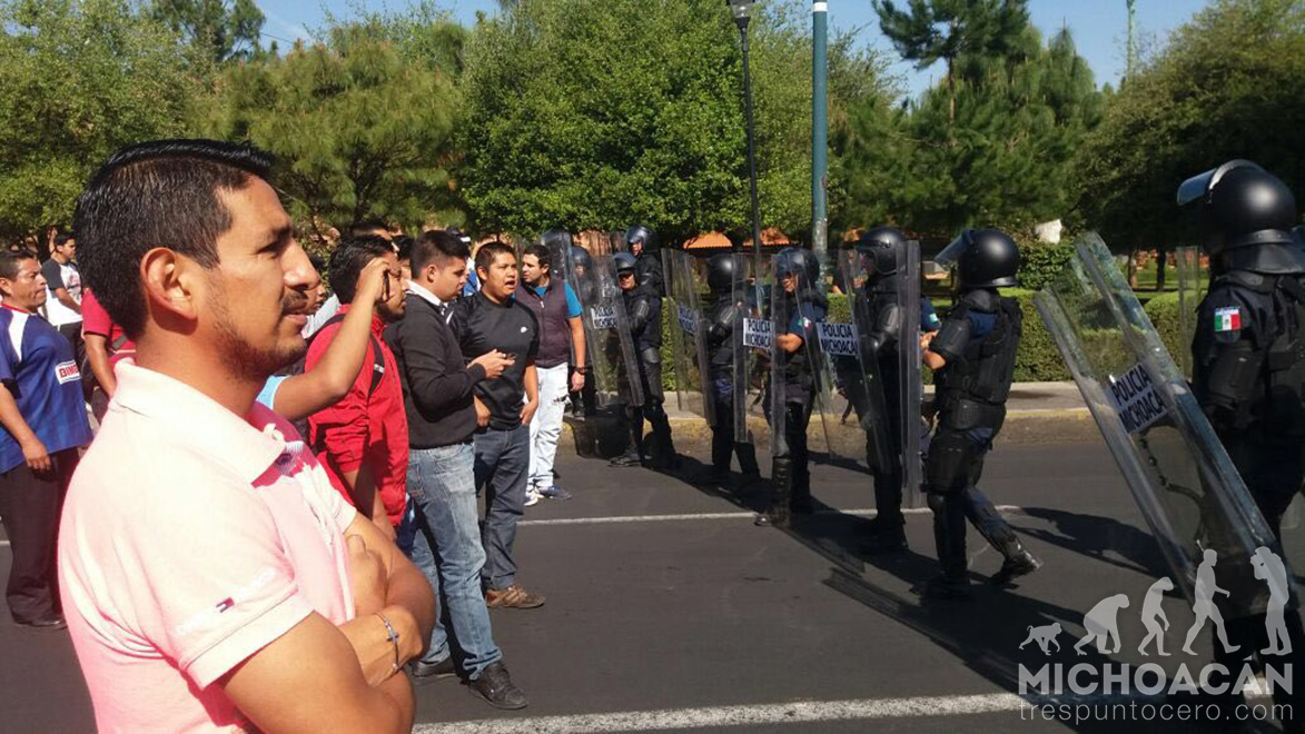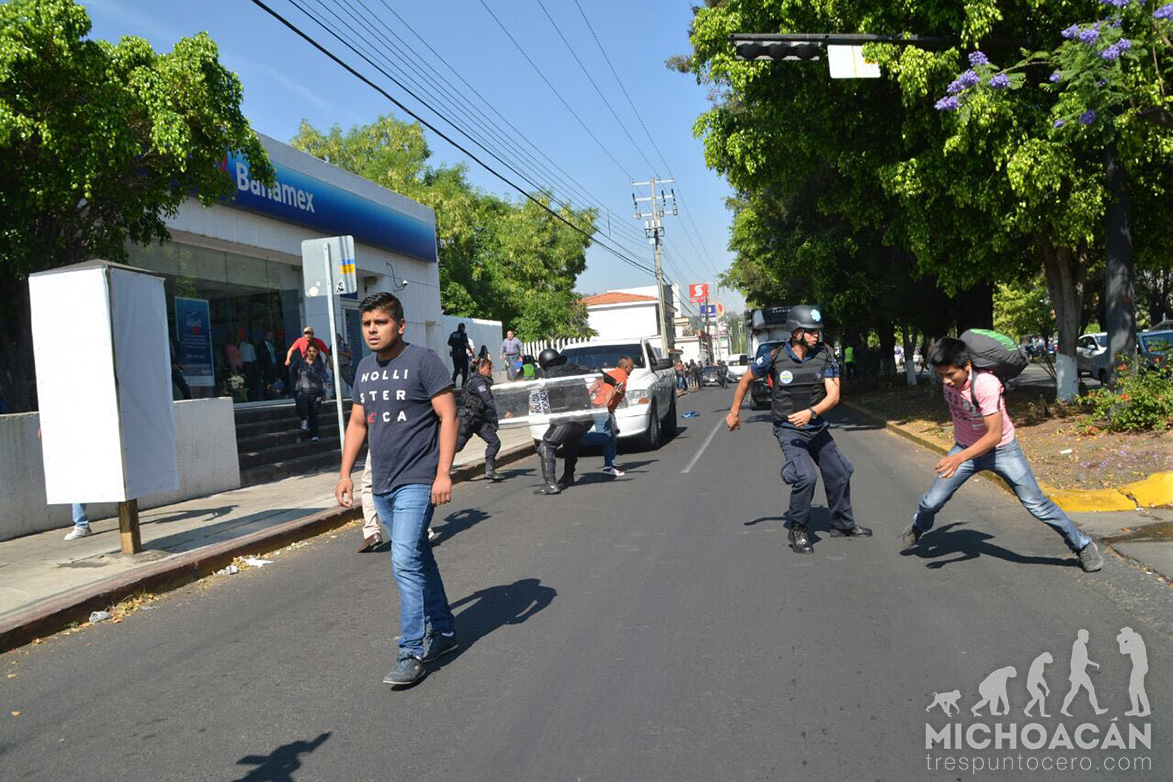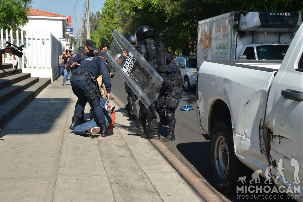 Elementos del Grupo de Operaciones Especiales (GOE) arribaron al sitio para replegar a los manifestantes, lo que derivó en un enfrentamiento que se extendió hasta la Avenida Camelinas frente a la plaza del mismo nombre, por lo que se procedió a detener a los docentes.