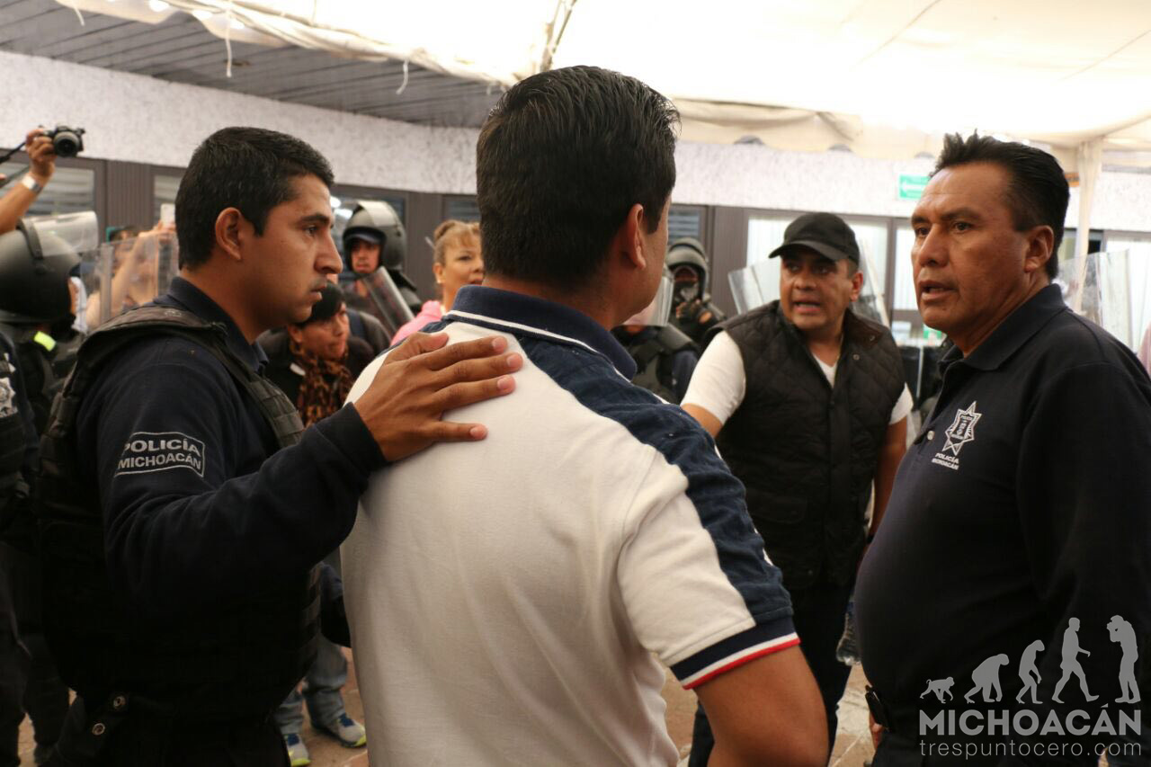 Morelia, Michoacán.-Más de 40 maestros de la Coordinadora Nacional de Trabajadores de la Educación (CNTE) fueron detenidos cuando ingresaron a la fuerza al salón Michoacán en el Centro de Convenciones de Morelia, donde se encuentra el titular de la Secretaría de Educación Pública (SEP), Aurelio Nuño Mayer.