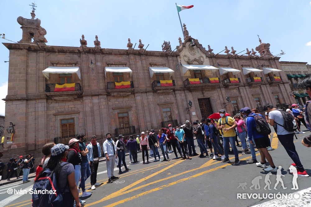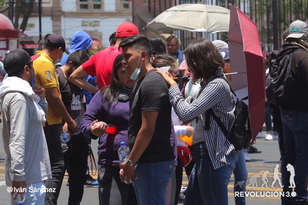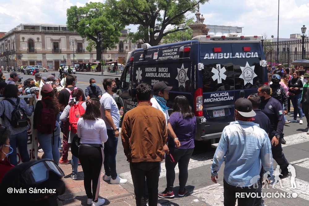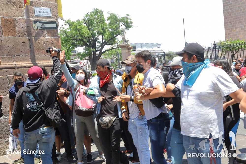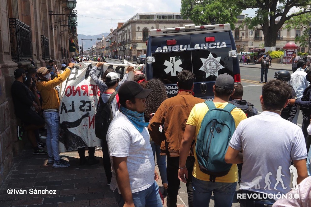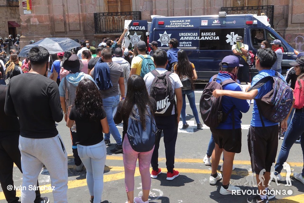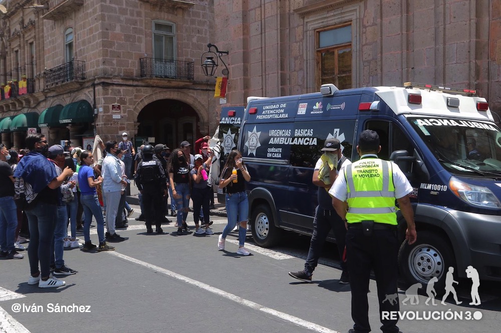 Morelia, Michoacán.- Jóvenes normalistas se manifestaron afuera del palacio de gobierno en el primer cuadro del centro histórico de la capital michoacana. Exigieron la liberación inmediata de 7 de sus compañeros detenidos en días pasados así como el rechazo a la reducción de matrícula de nuevo ingresó a las normales del estado. Durante la manifestación una joven se desvaneció debido al intenso sol y a la alta temperatura; fue atendida por paramédicos de la Policía Michoacán.