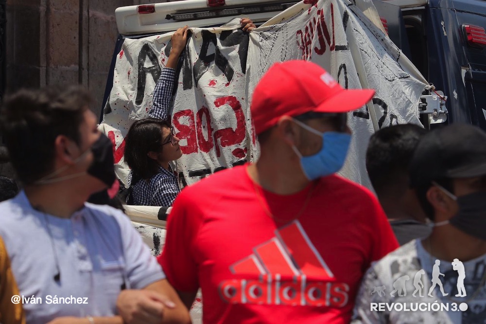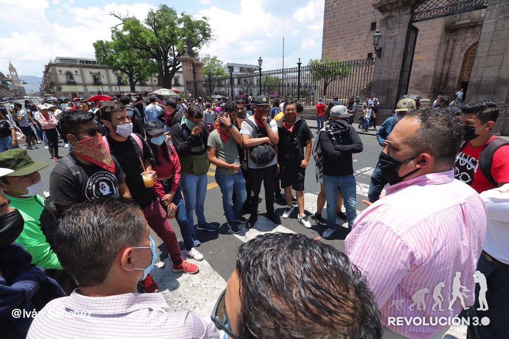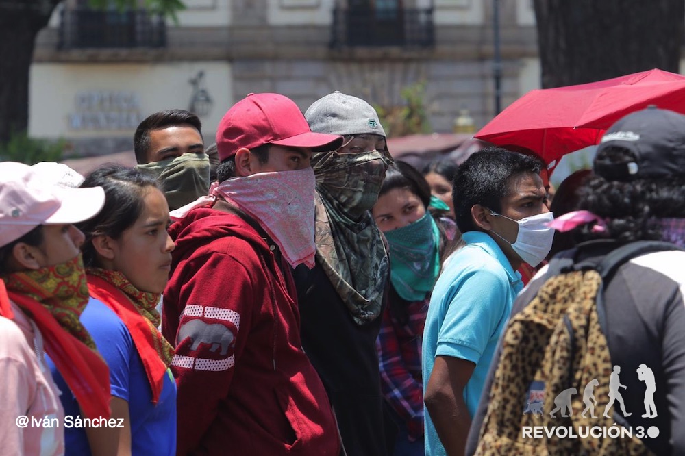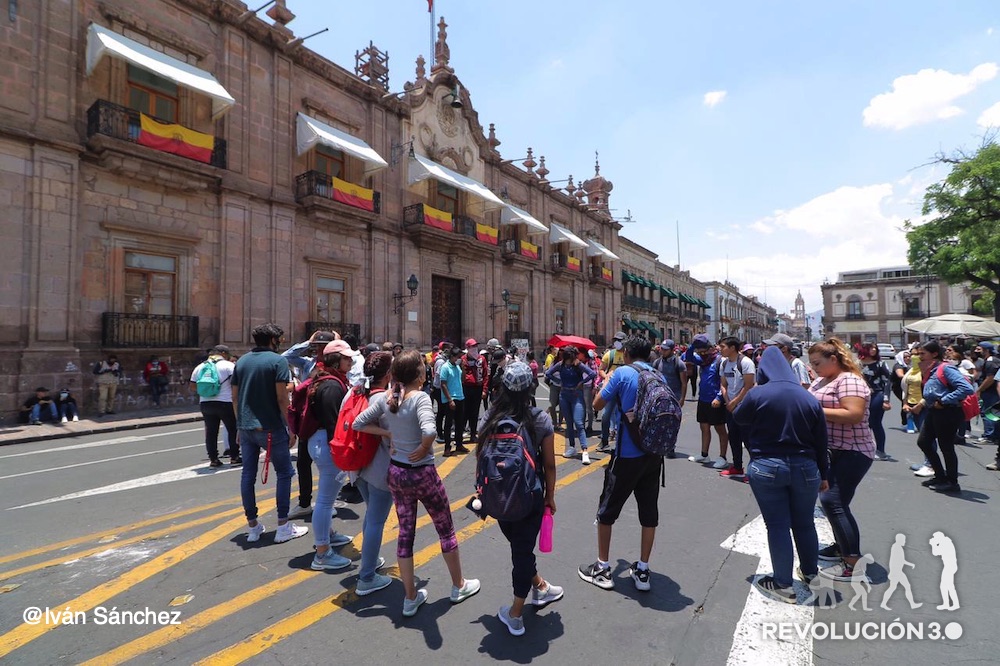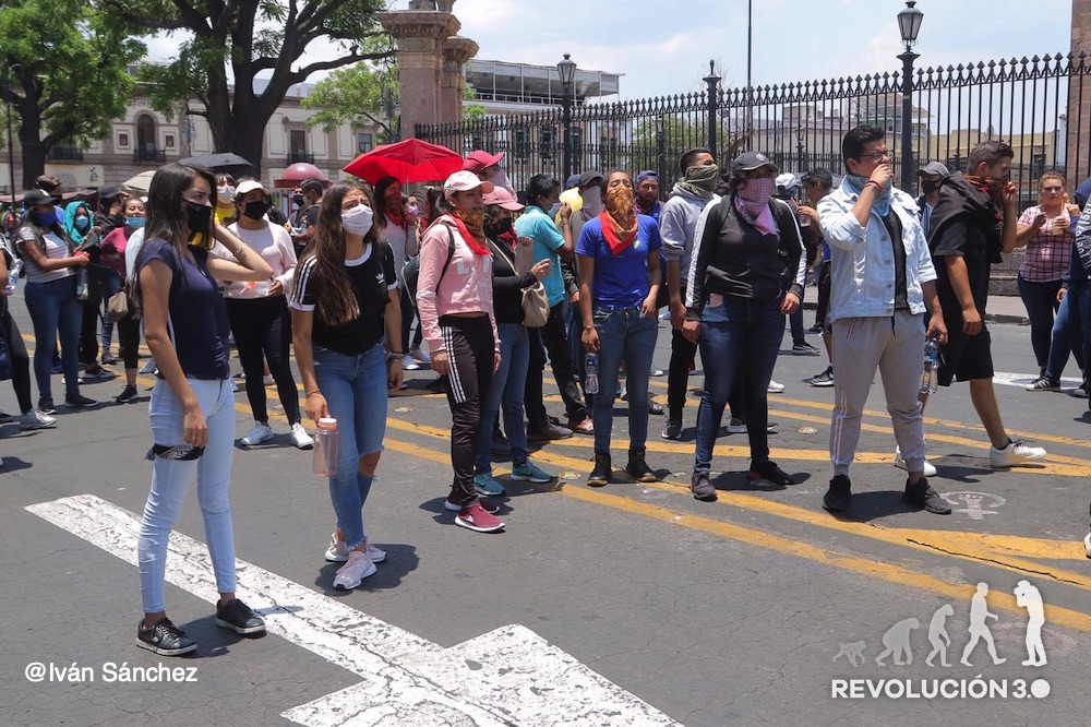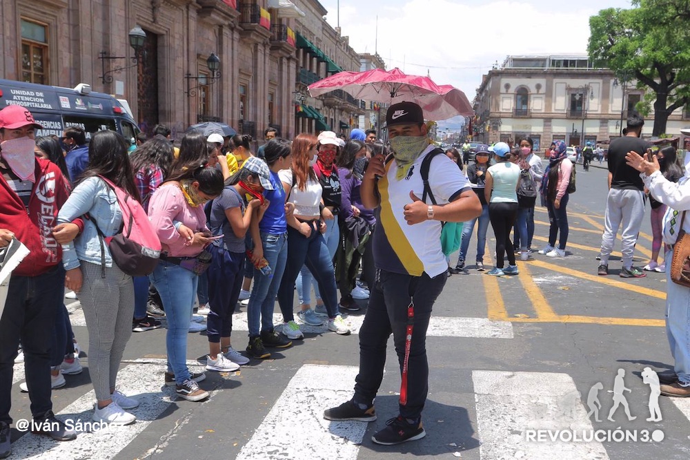Morelia, Michoacán.- Jóvenes normalistas se manifestaron afuera del palacio de gobierno en el primer cuadro del centro histórico de la capital michoacana. Exigieron la liberación inmediata de 7 de sus compañeros detenidos en días pasados así como el rechazo a la reducción de matrícula de nuevo ingresó a las normales del estado. Durante la manifestación una joven se desvaneció debido al intenso sol y a la alta temperatura; fue atendida por paramédicos de la Policía Michoacán.