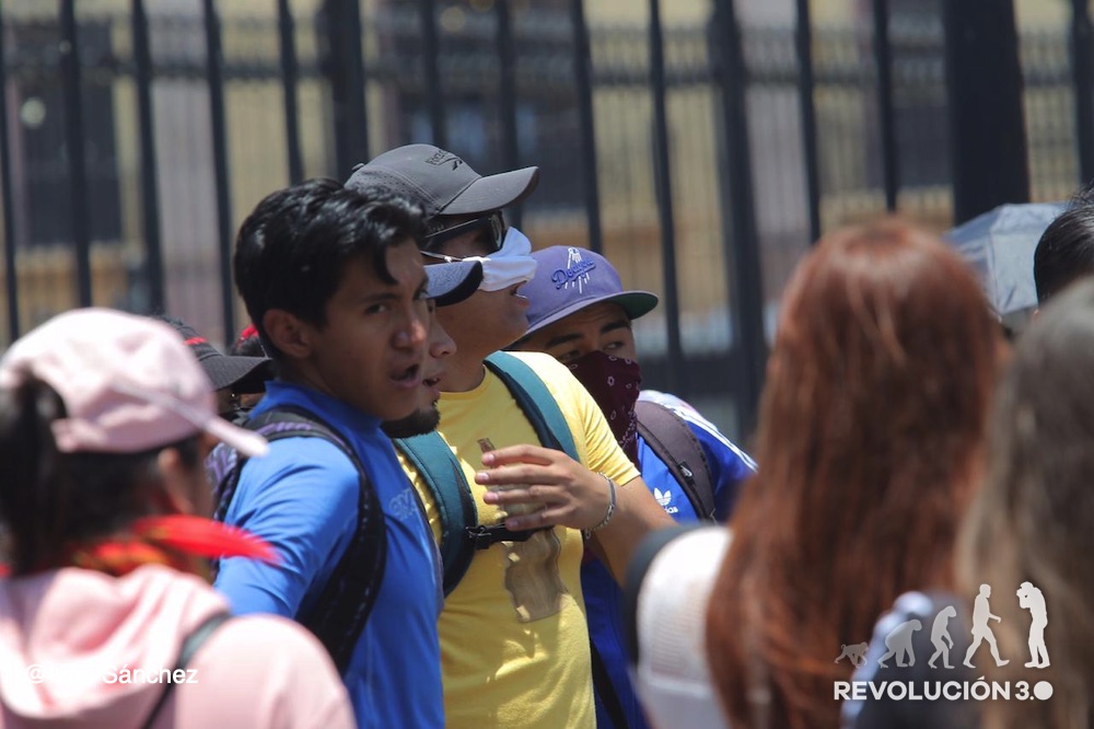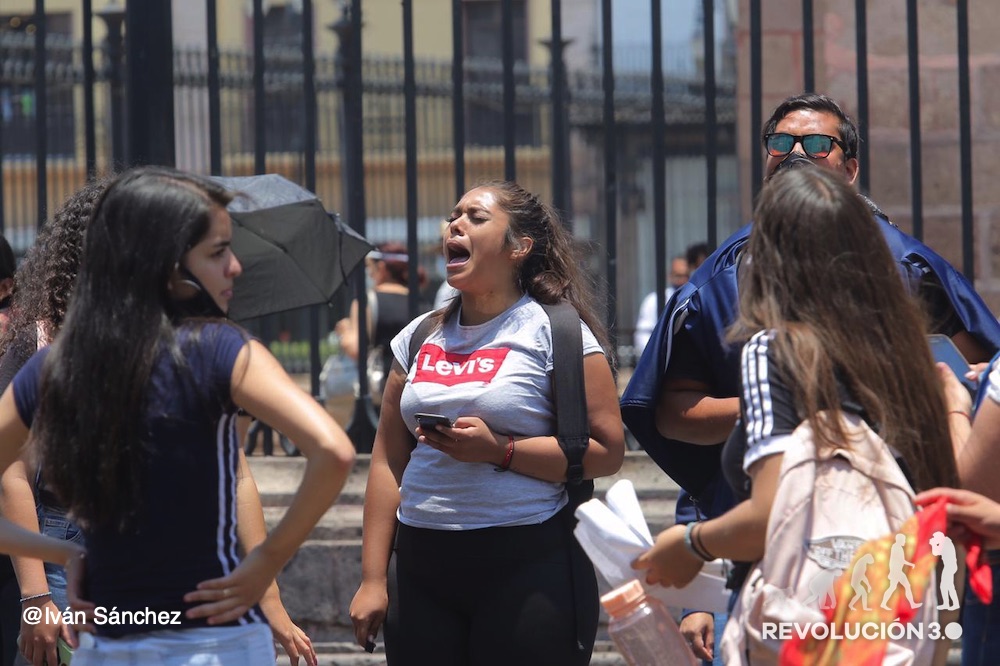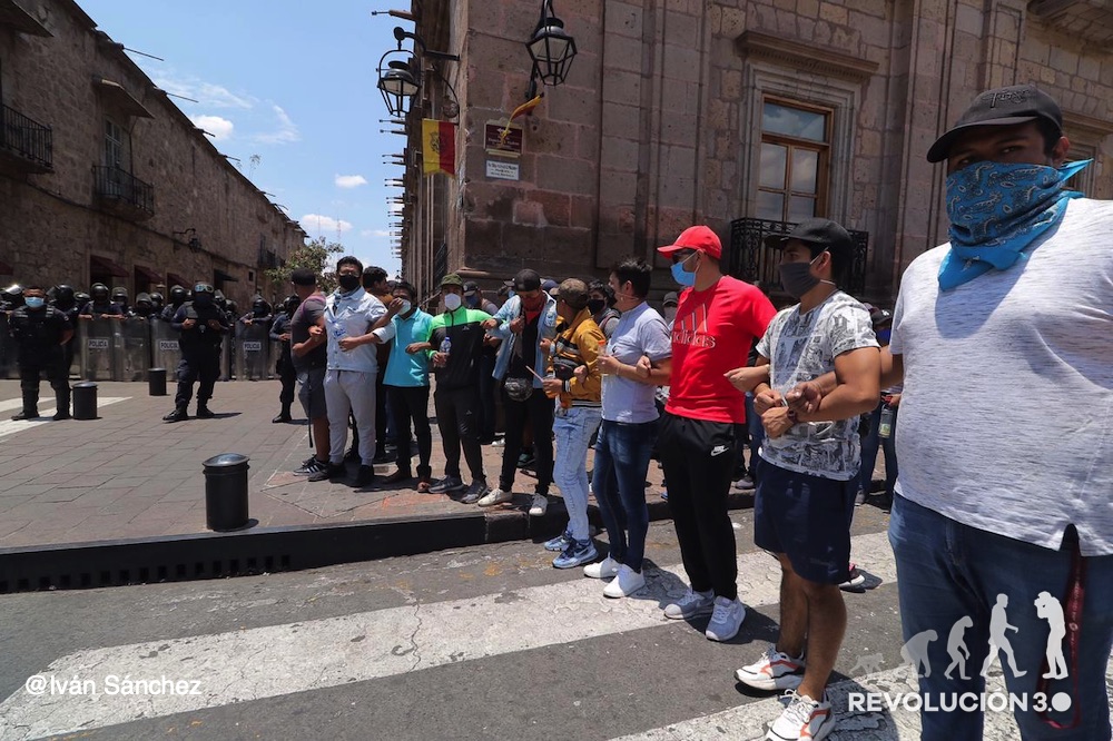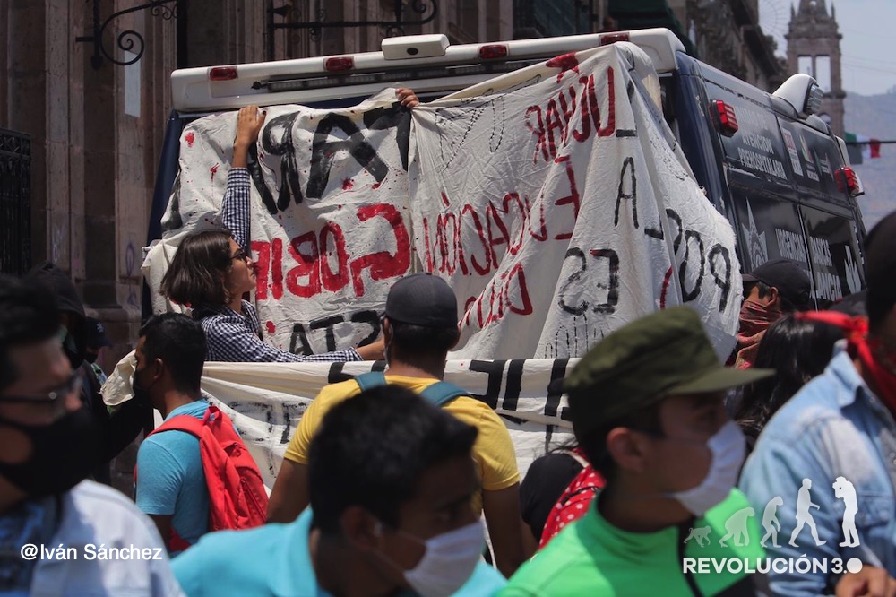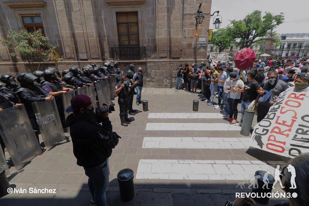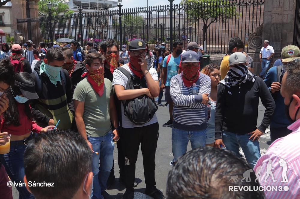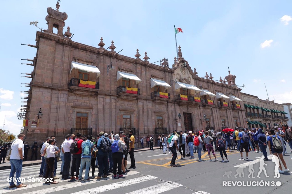 Morelia, Michoacán.- Jóvenes normalistas se manifestaron afuera del palacio de gobierno en el primer cuadro del centro histórico de la capital michoacana. Exigieron la liberación inmediata de 7 de sus compañeros detenidos en días pasados así como el rechazo a la reducción de matrícula de nuevo ingresó a las normales del estado. Durante la manifestación una joven se desvaneció debido al intenso sol y a la alta temperatura; fue atendida por paramédicos de la Policía Michoacán.