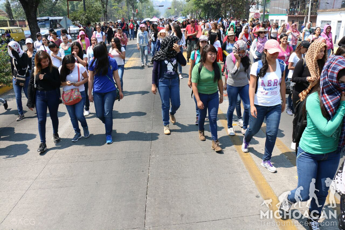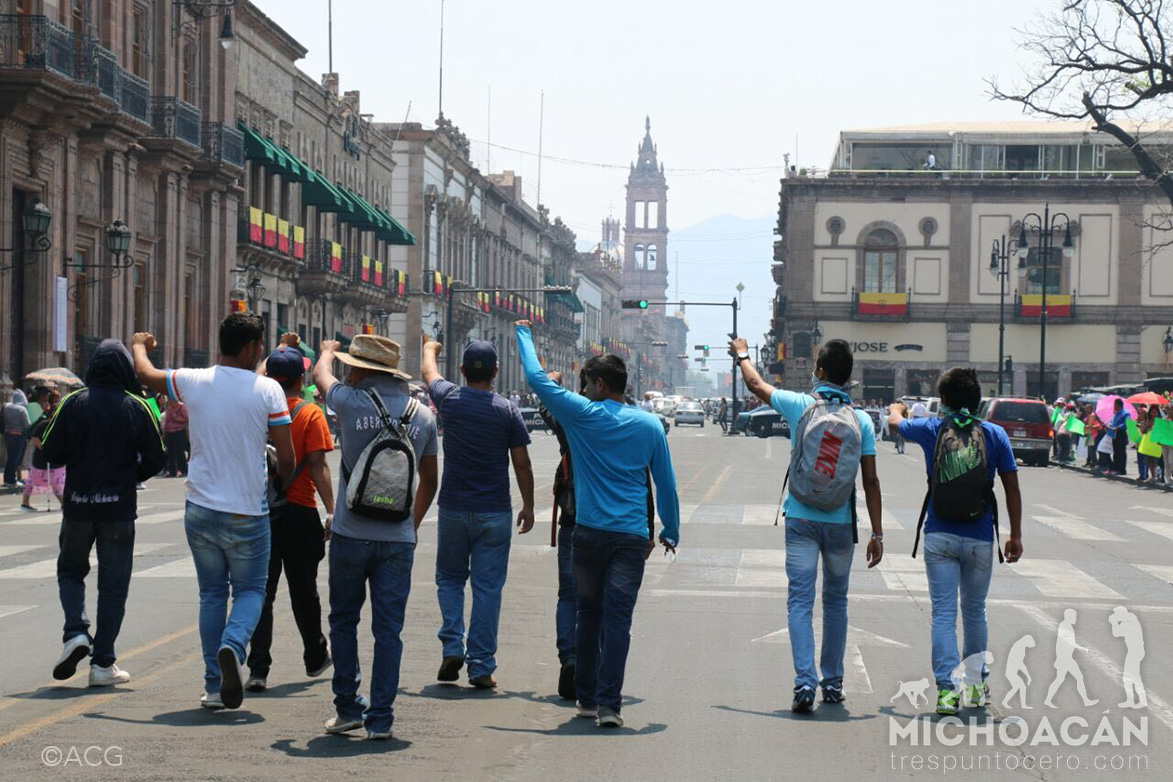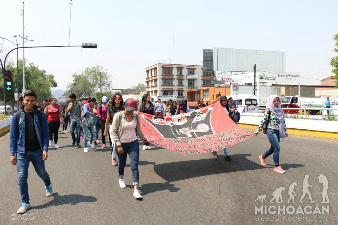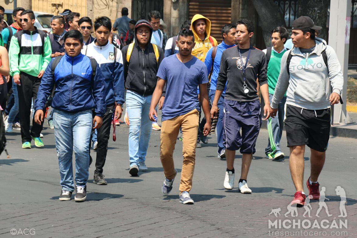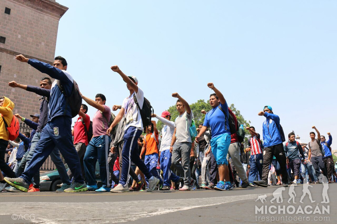 Morelia, Michoacán.-Estudiantes de la Organización de Normales Oficiales del Estado (ONOEM) se manifestaron en la capital michoacana luego de que no les han entregado el pago de becas por concepto de alimentación y transporte.