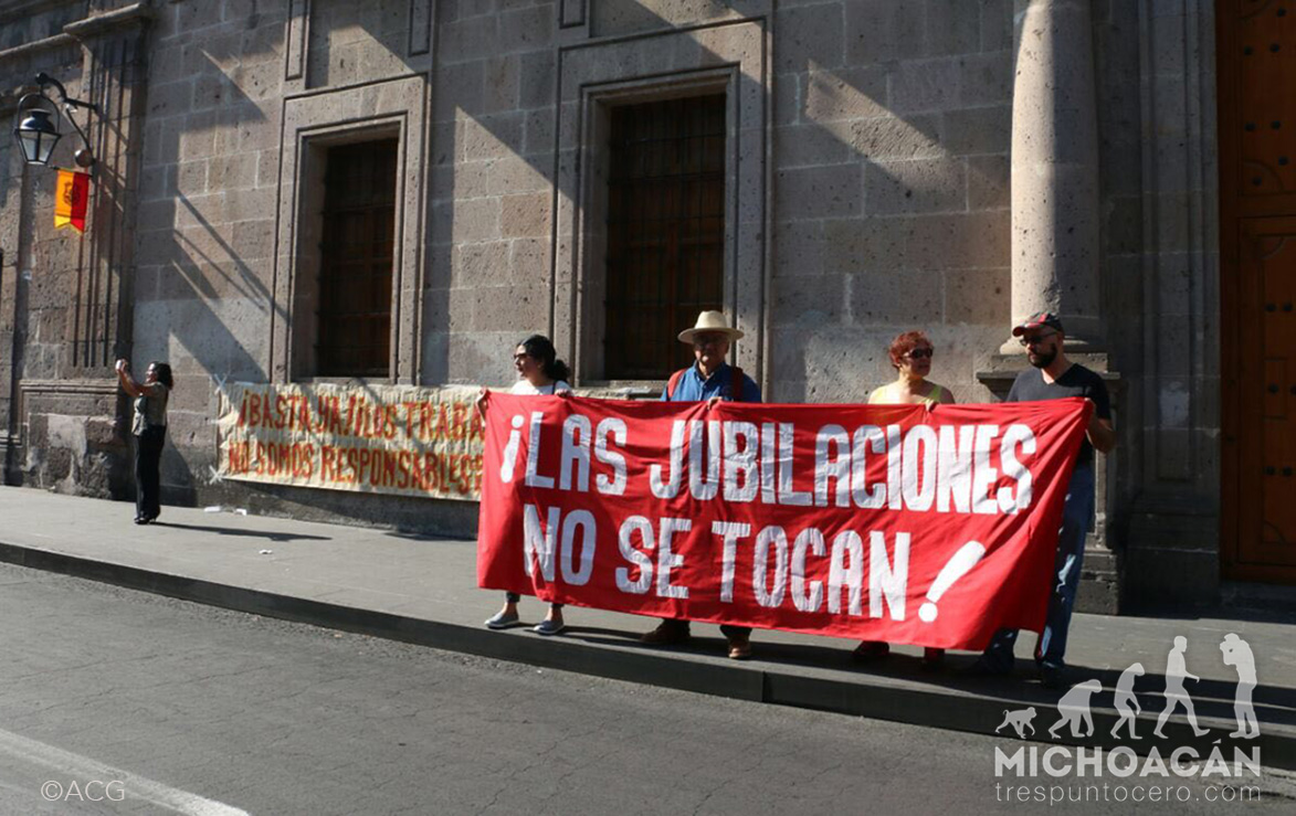 “Las jubilaciones no se tocan”, “Exigimos la renuncia del rector Medarno Serna”, rezaban algunas mantas que portaron los sindicalizados y jubilados a las afueras del Centro Histórico.